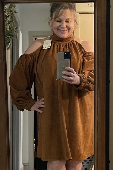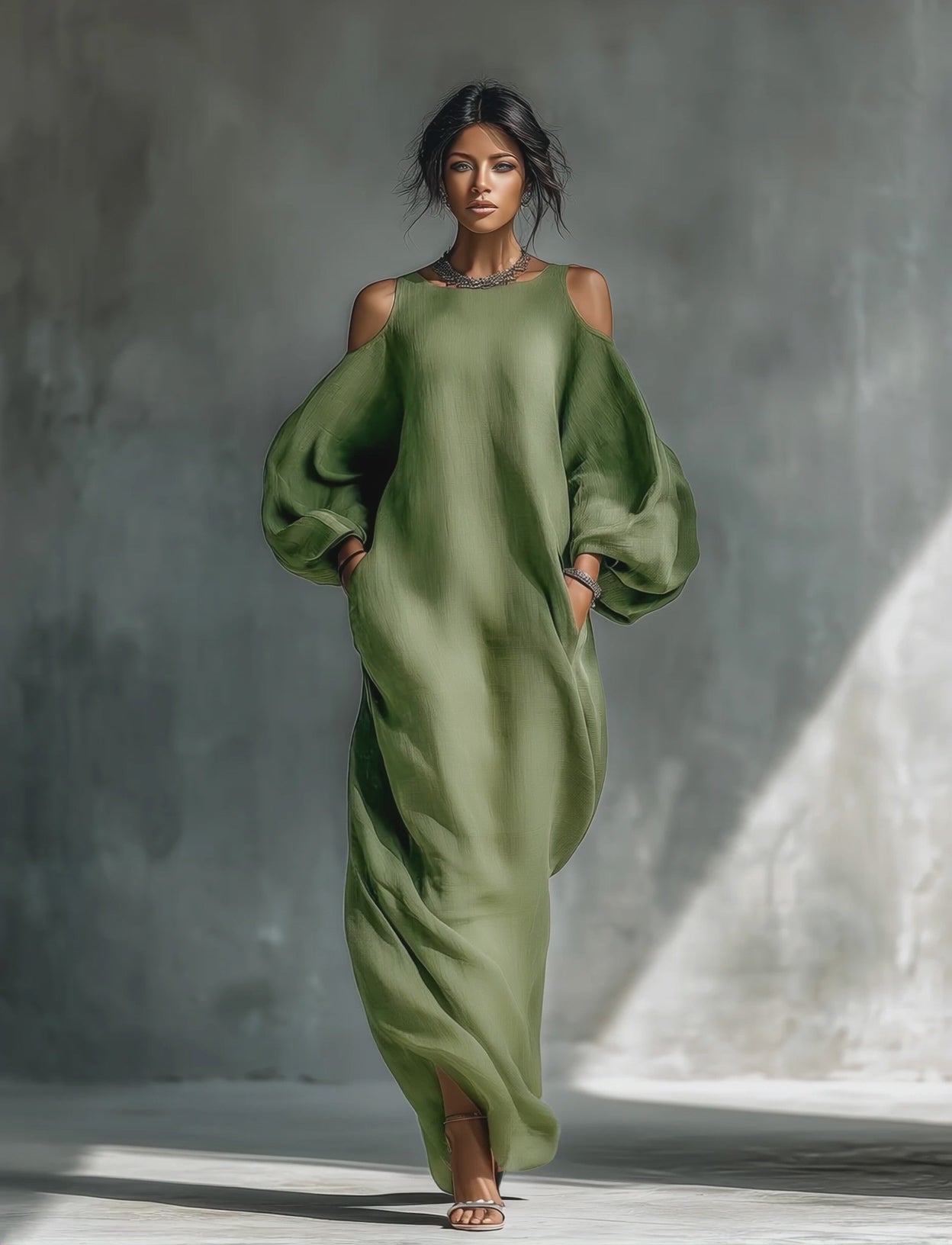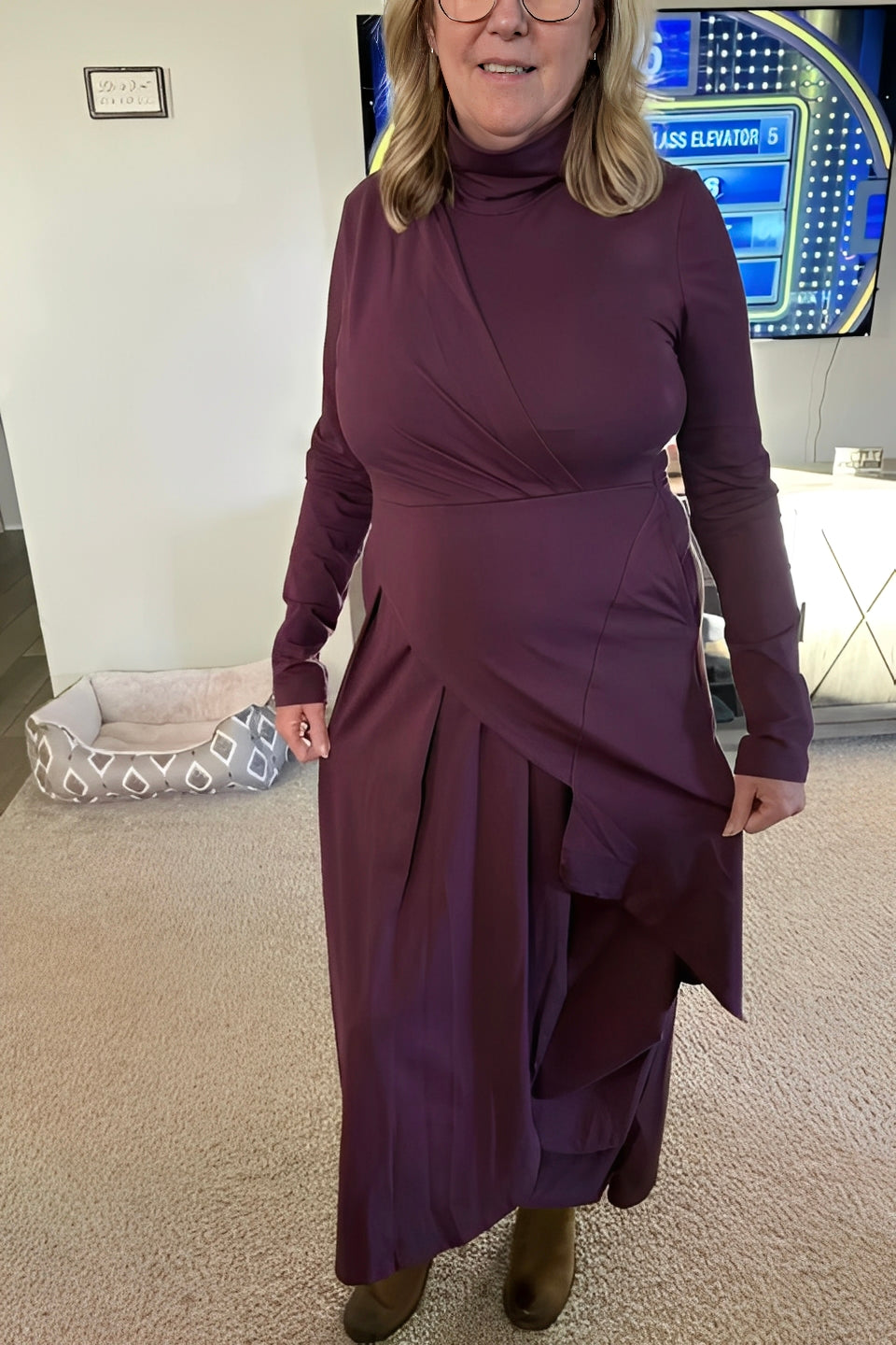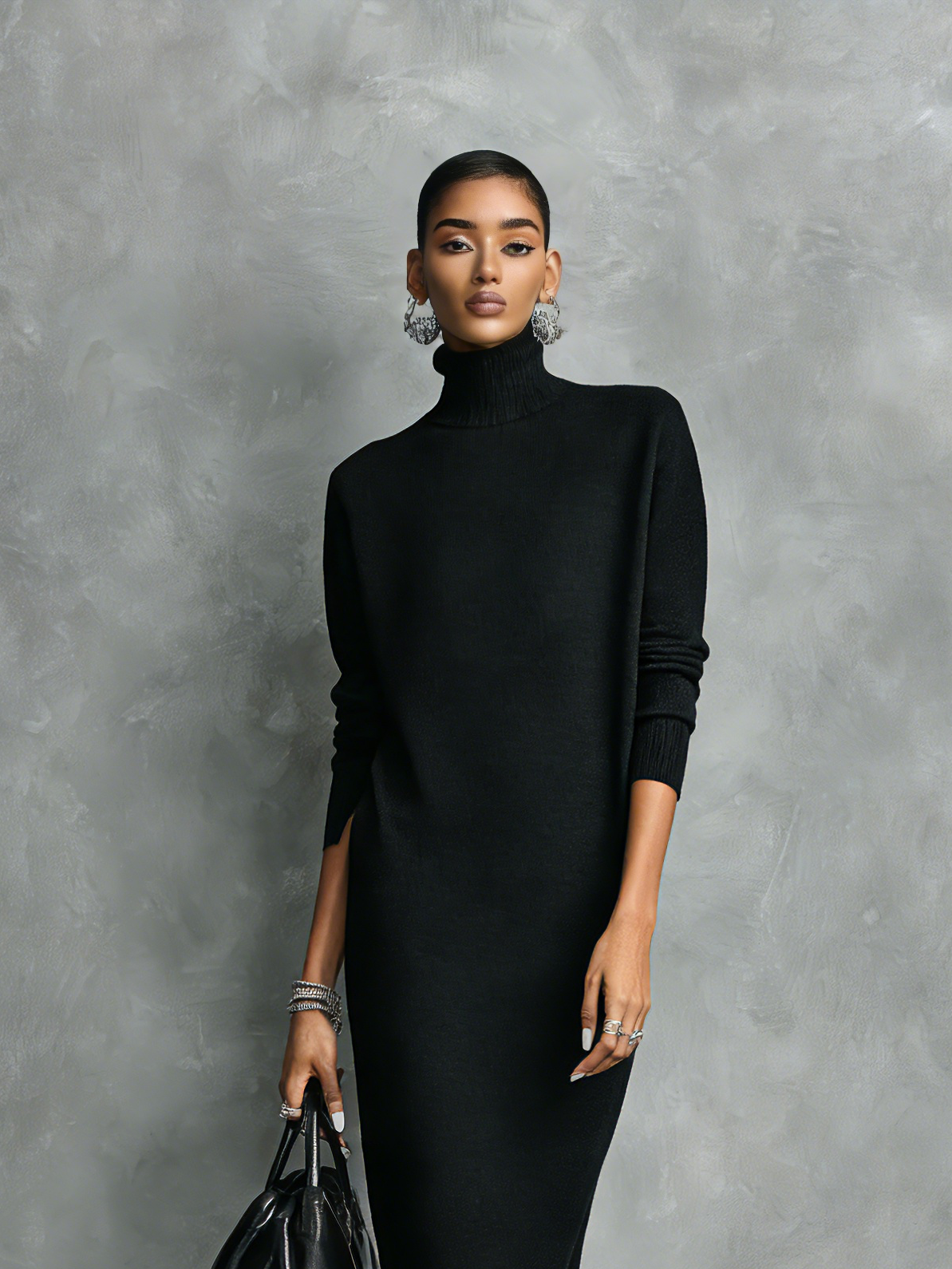 This dress is absolutely stunning and effortlessly chic. I love the cold-shoulder design paired with the high neckline—it adds just the right amount of edge while still feeling elegant.