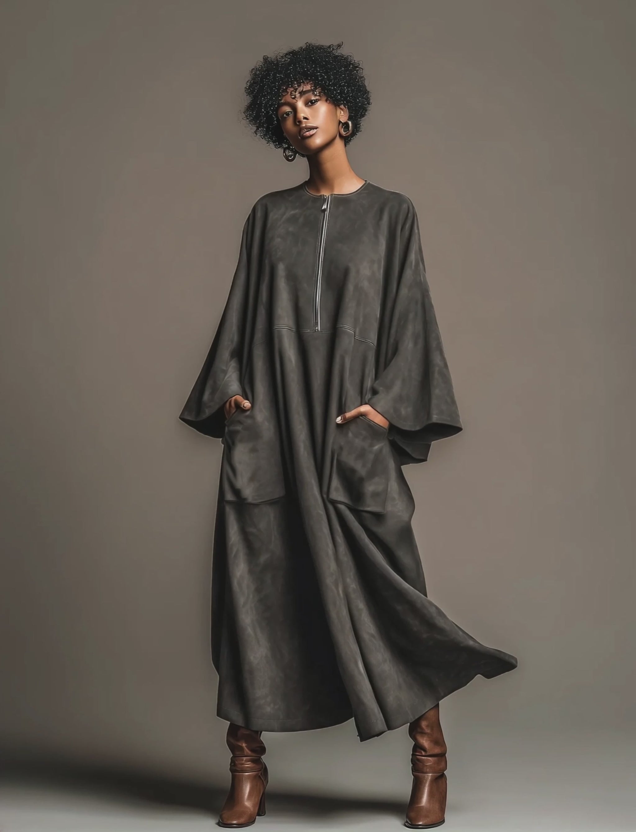 A loose-fitting faux suede maxi dress featuring a round neckline, front zipper, and flared sleeves, offering effortless elegance with a soft touch.