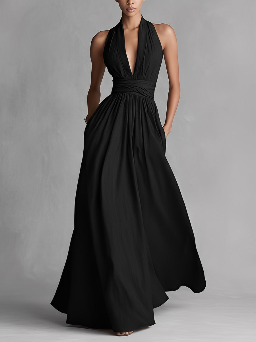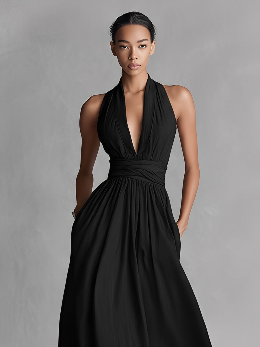Women's Black Woven Dress With Halter Neck & Deep V Detail, Timeless Sleek-Elegant Style Dress MDZ1239A6I