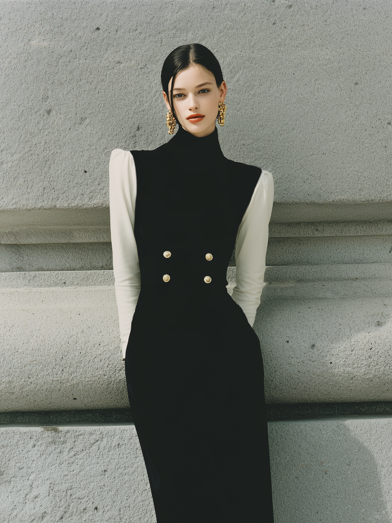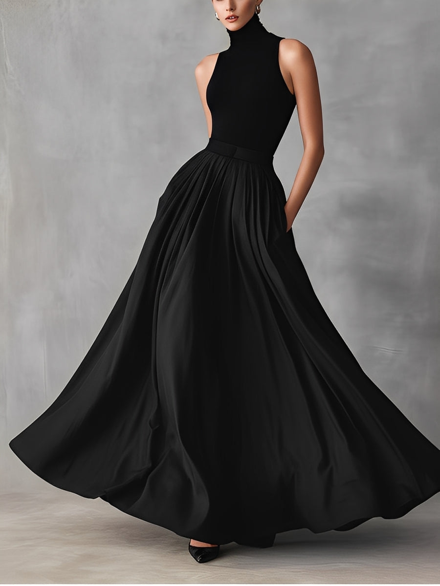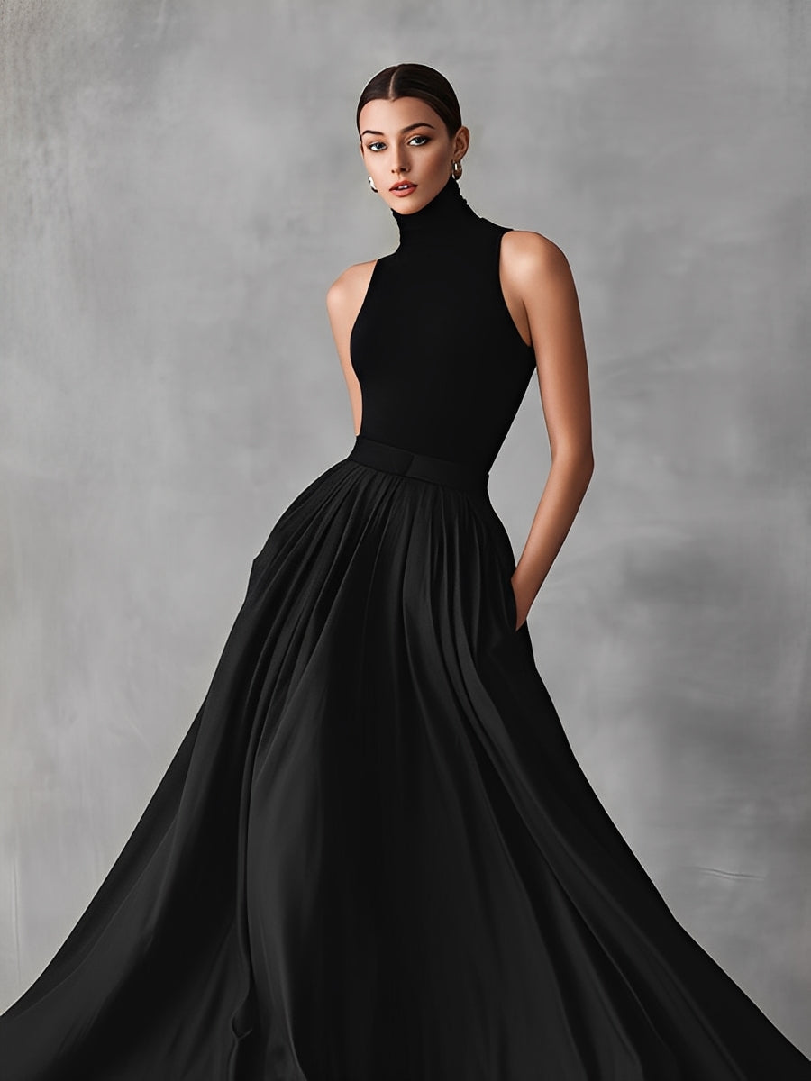 Women's Jet Black Structured Dress With Flowy Skirt, Modern Bold-Chic Style Dress MDZ1226A8I