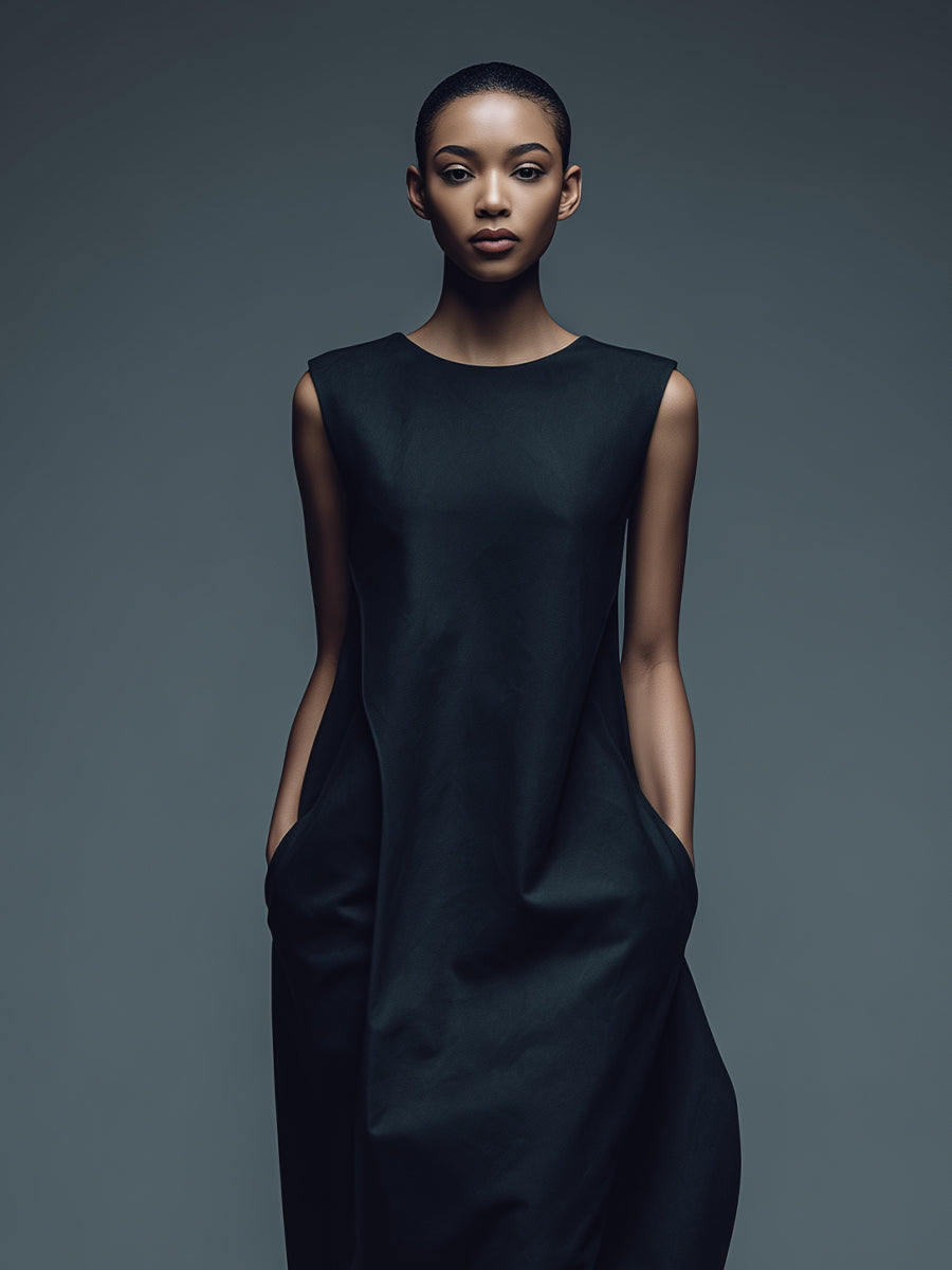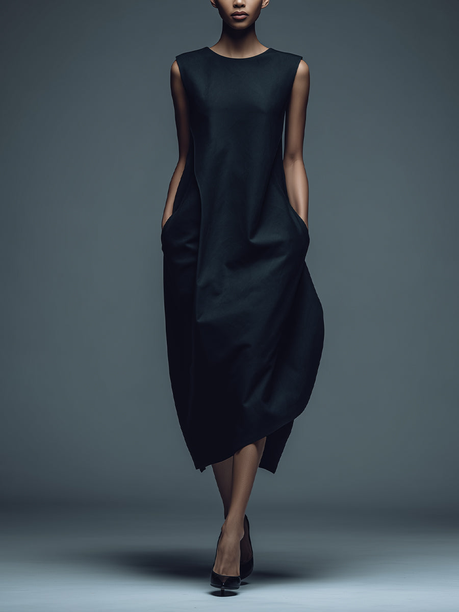 Women's Black Structured Woven Dress With Sleeveless Silhouette & Side Pockets, Timeless Minimalist-Chic Style Dress MDZ1302A2I