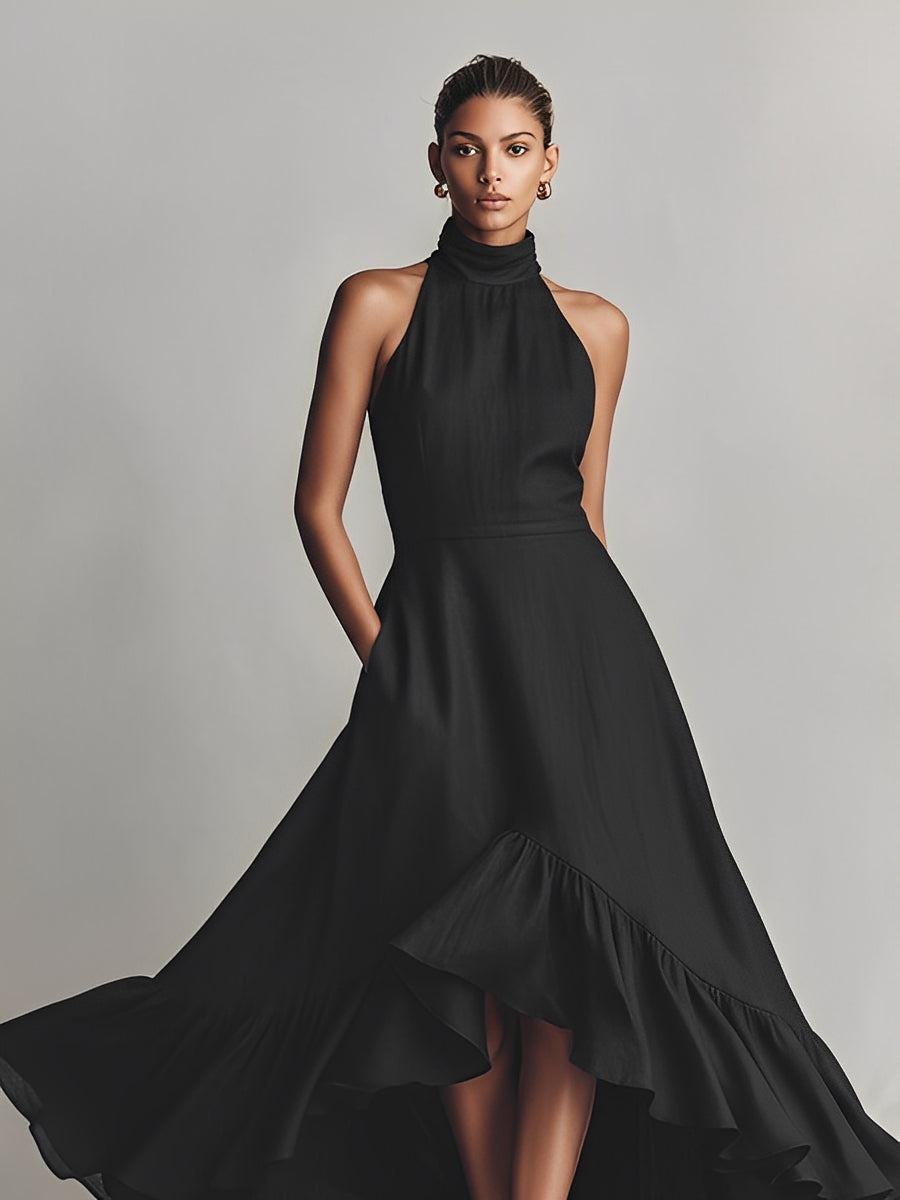 Women's Black Woven Dress With Halter Neck & Ruffled High-Low Skirt, Timeless Sleek-Elegant Style Dress MDZ0625A4I