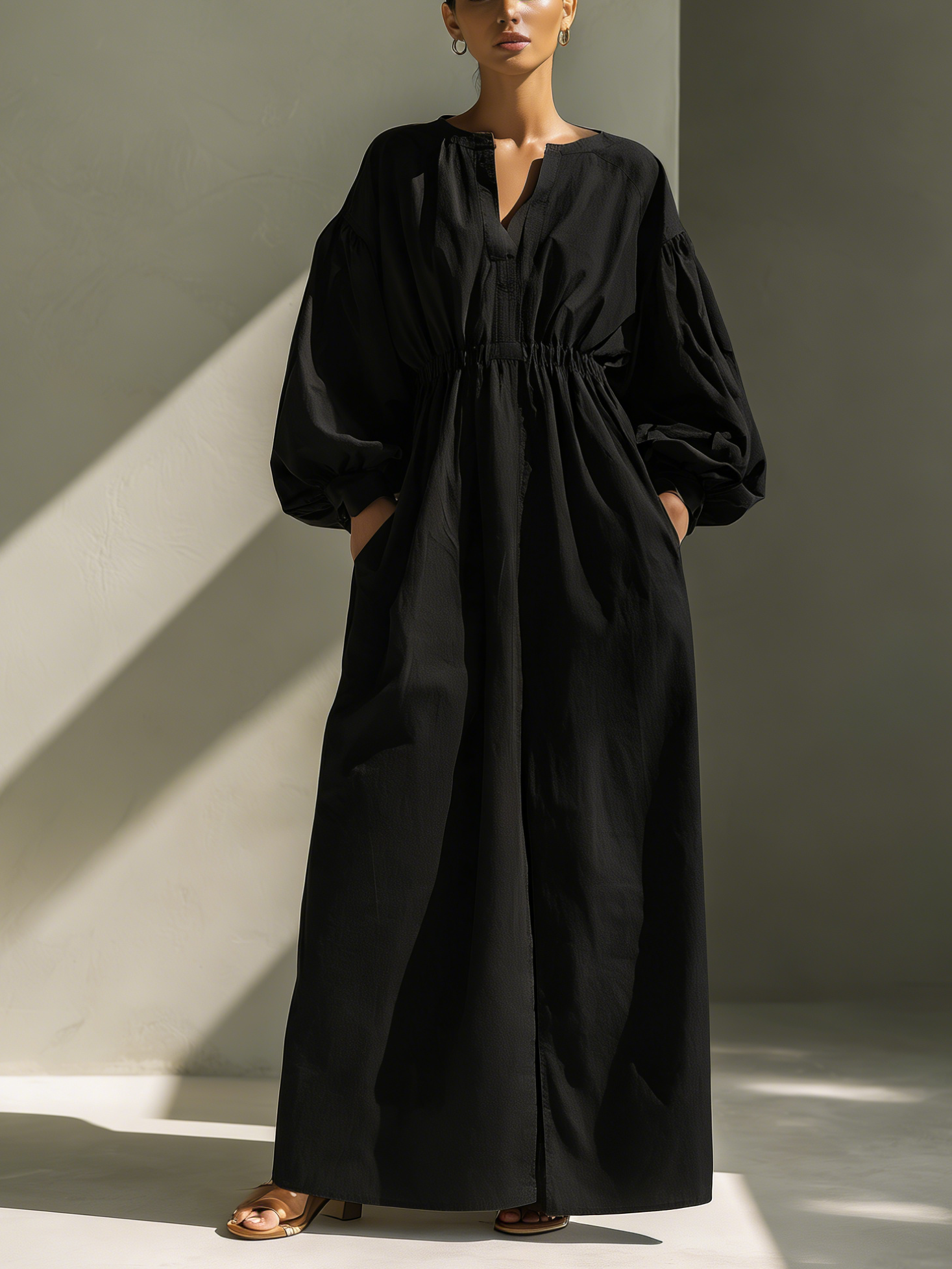 Women's Casual Black Cotton And Linen V-neck Loose Long-sleeved Maxi Dress MDZ1224A6AN