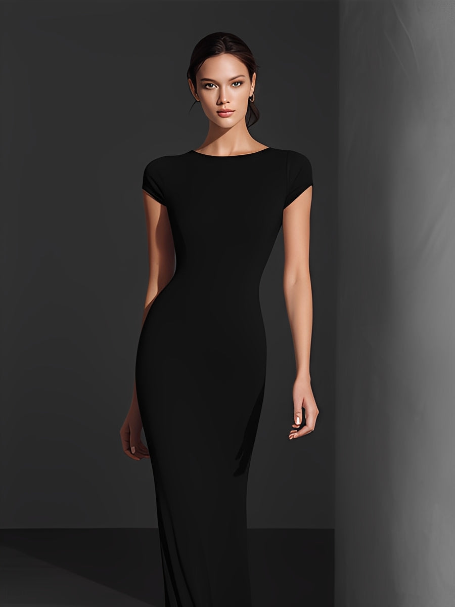 Women's Black Stretch Knit Dress With Cap Sleeves & Bodycon Silhouette, Timeless Sleek-Sophisticated Style Dress MDZ1253A5I