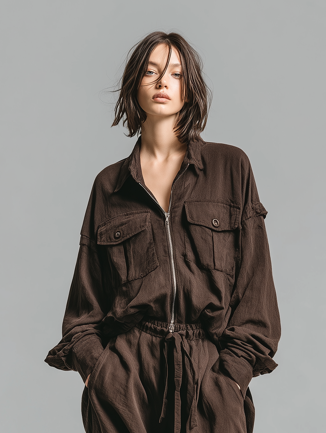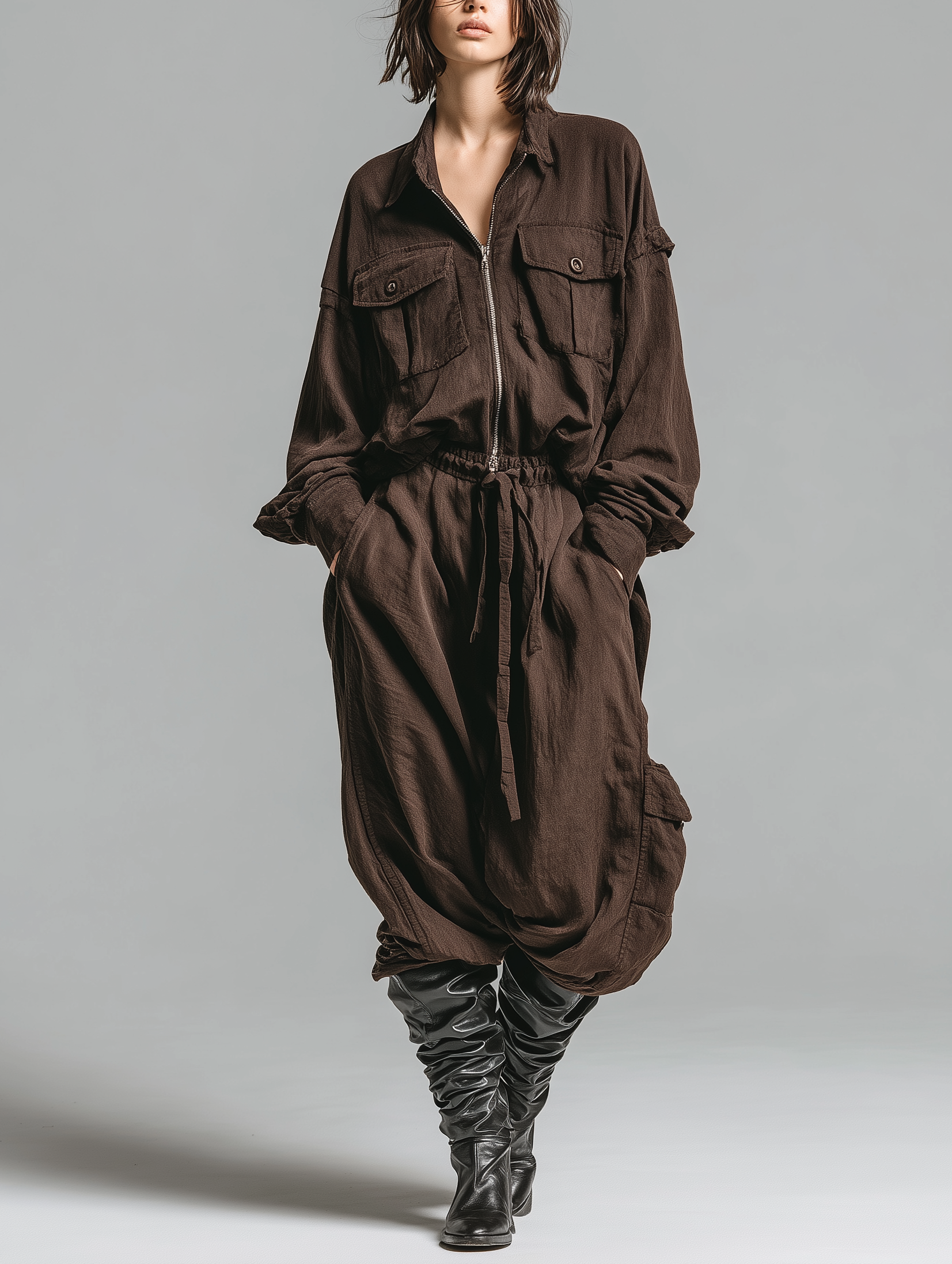 Women's Fashionable Casual Brown Long-sleeved Shirt Collar Jumpsuit With Zipper And Pockets MDA1829K3AN