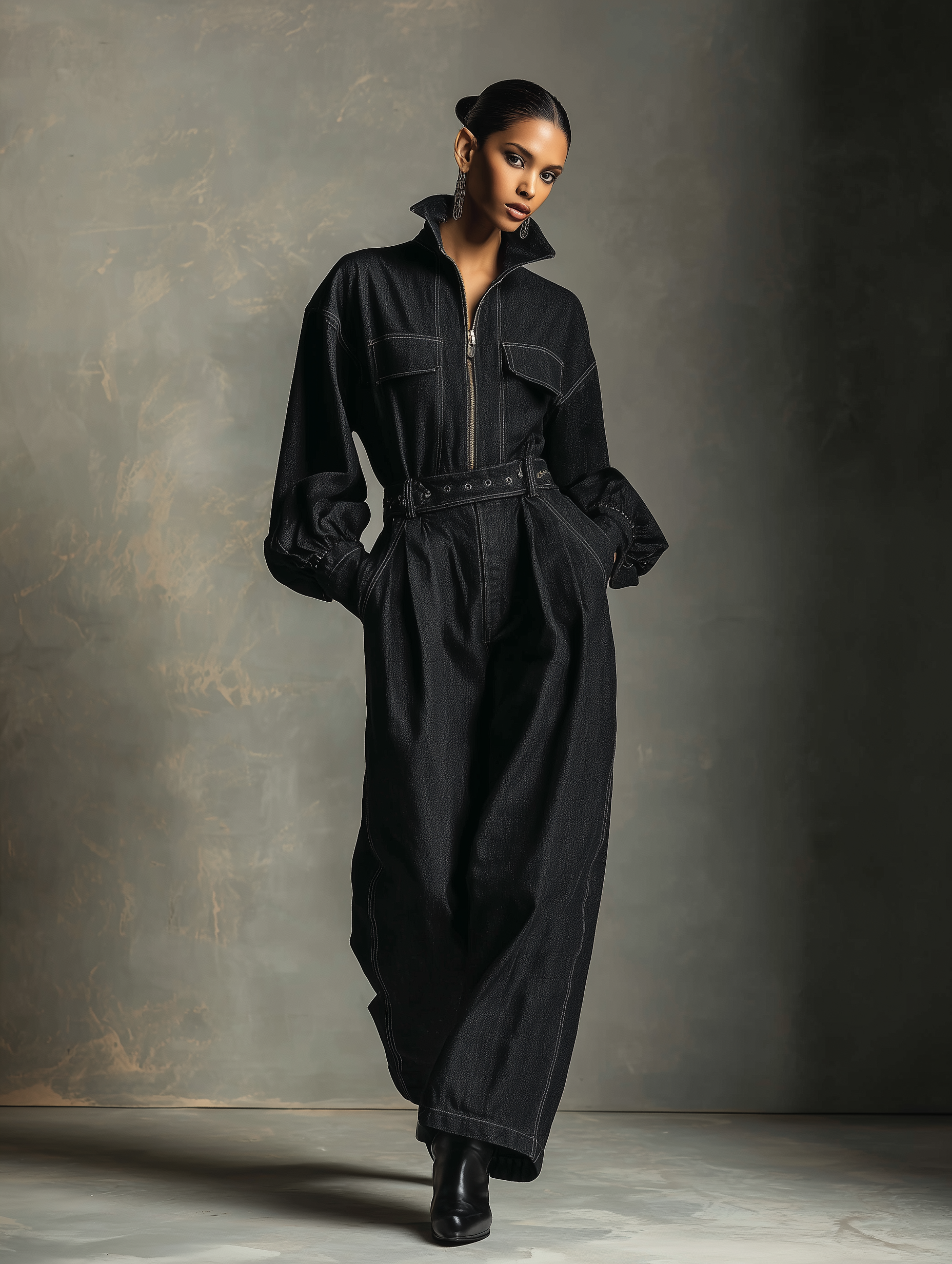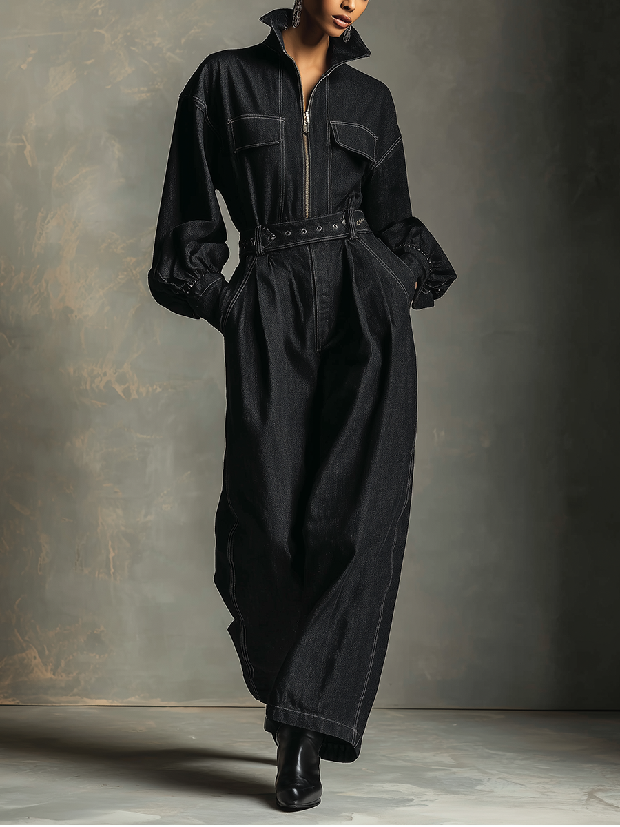 Women's Lapel Single Breasted Long Sleeve Belted Jumpsuit MDA2274G1Y