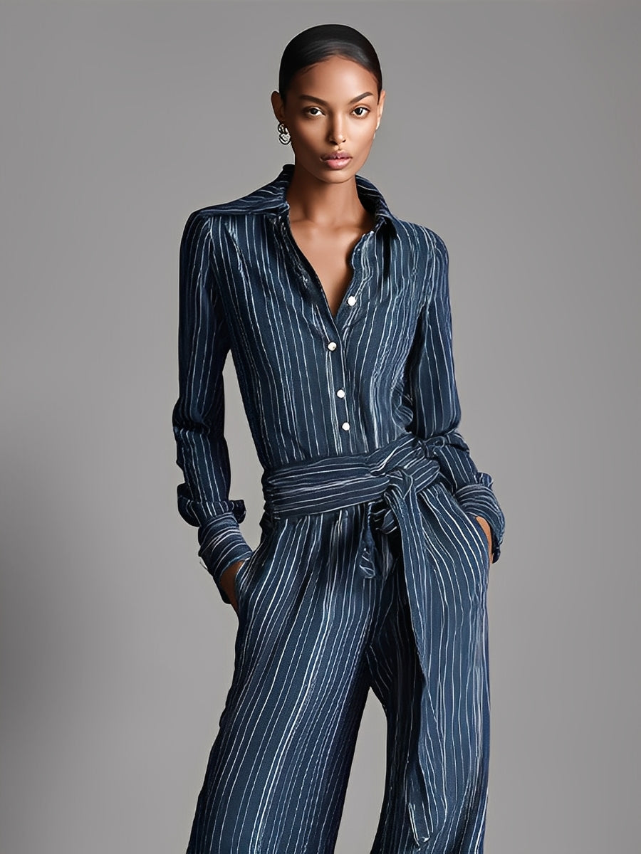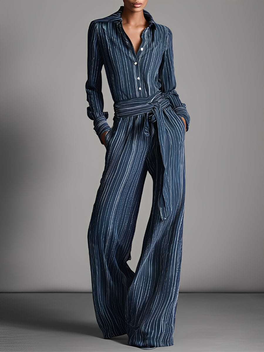 Women's Navy Blue And White Striped Wide-Leg Jumpsuit MDA2882K2I