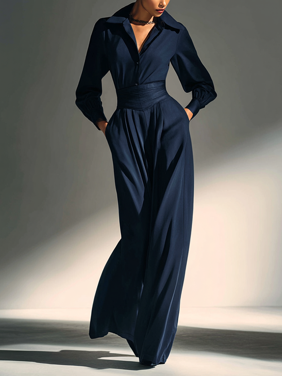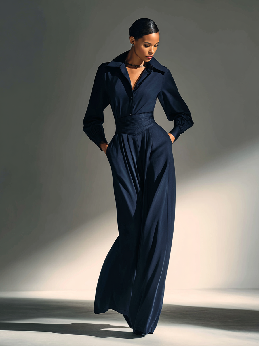 Women’s Navy Elegant Collared Wide-Leg Tailored Jumpsuit MDA1786K5AP