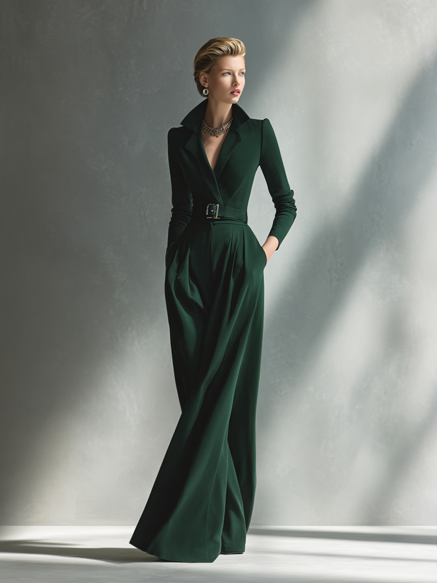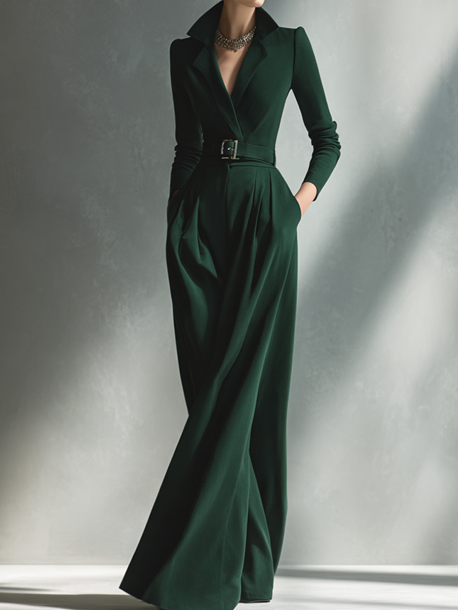 Women’s Dark Green Elegant Tailored Belted Wide-Leg Jumpsuit(without Belt) MDA1740K5AP
