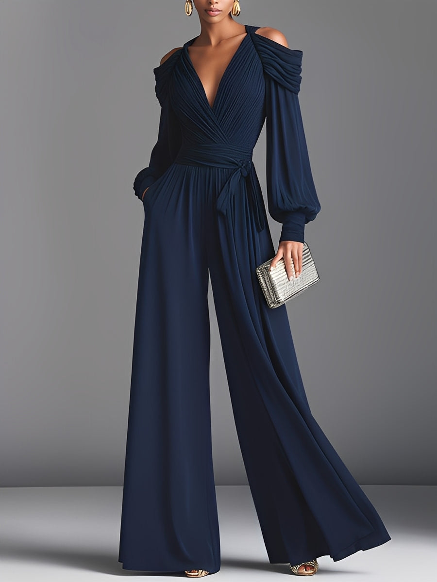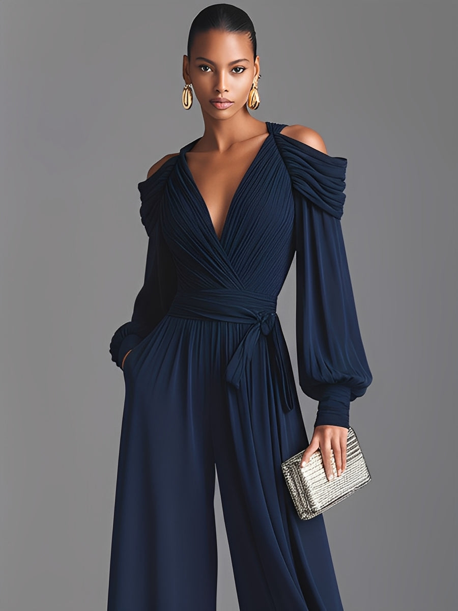 Women's Off-the-shoulder Long-sleeved Pleated Fabric Jumpsuit MDA1515G1Y