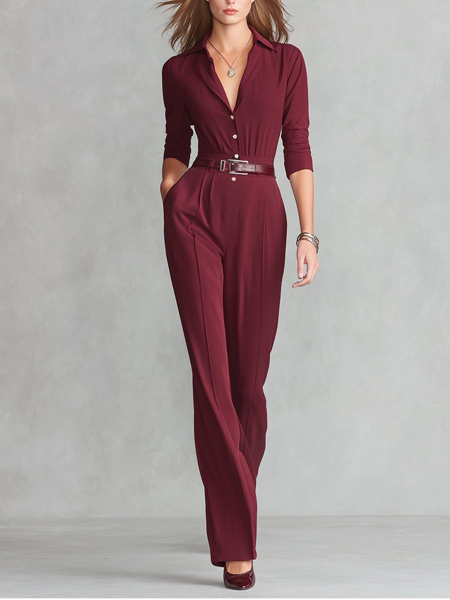 Women's Burgundy Cotton-Blend Elegant Jumpsuit With Shirt Collar & Belted Waist, Timeless Formal Style Jumpsuit MDA2930K3I