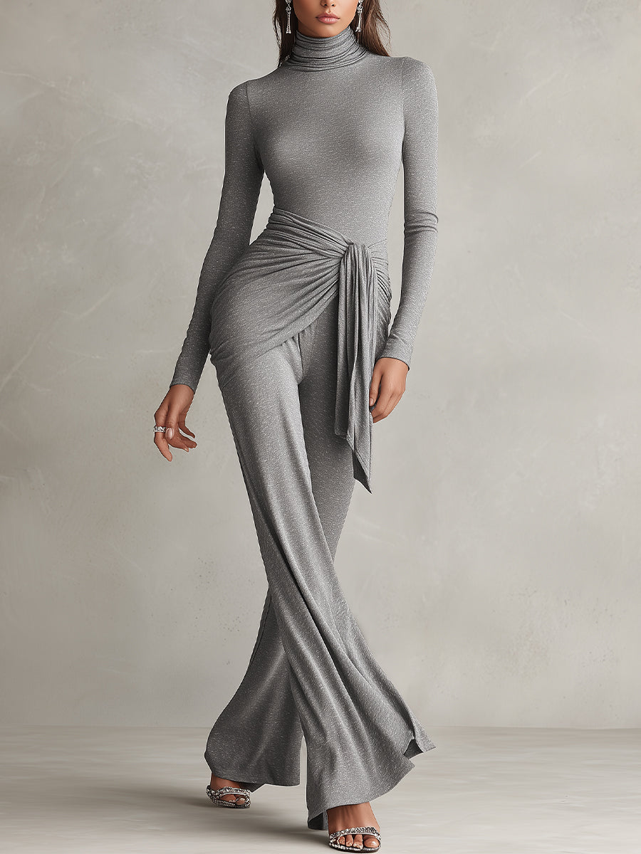 Women's Grey Stretch Knit Elegant High-Neck Draped Waist Jumpsuit MDA2400K8I