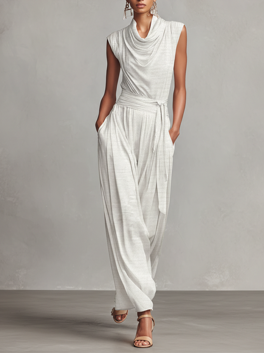 Women's Light Gray Textured Knit Jumpsuit With Cowl Neck & Belted Waist, Timeless Luxe-Elegant Style Jumpsuit MDZ1394A3I