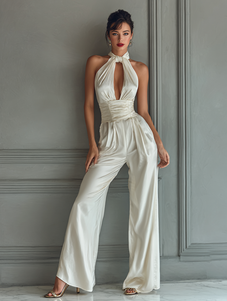 Women's Ivory Satin Fabric Halter Jumpsuit With Deep V-Neck & Elastic Waist MDZ1460A6T