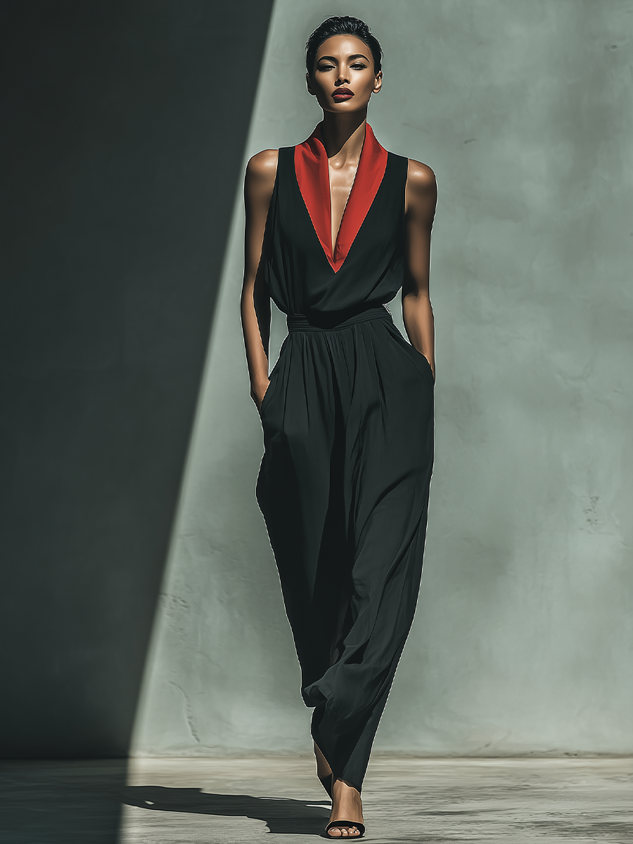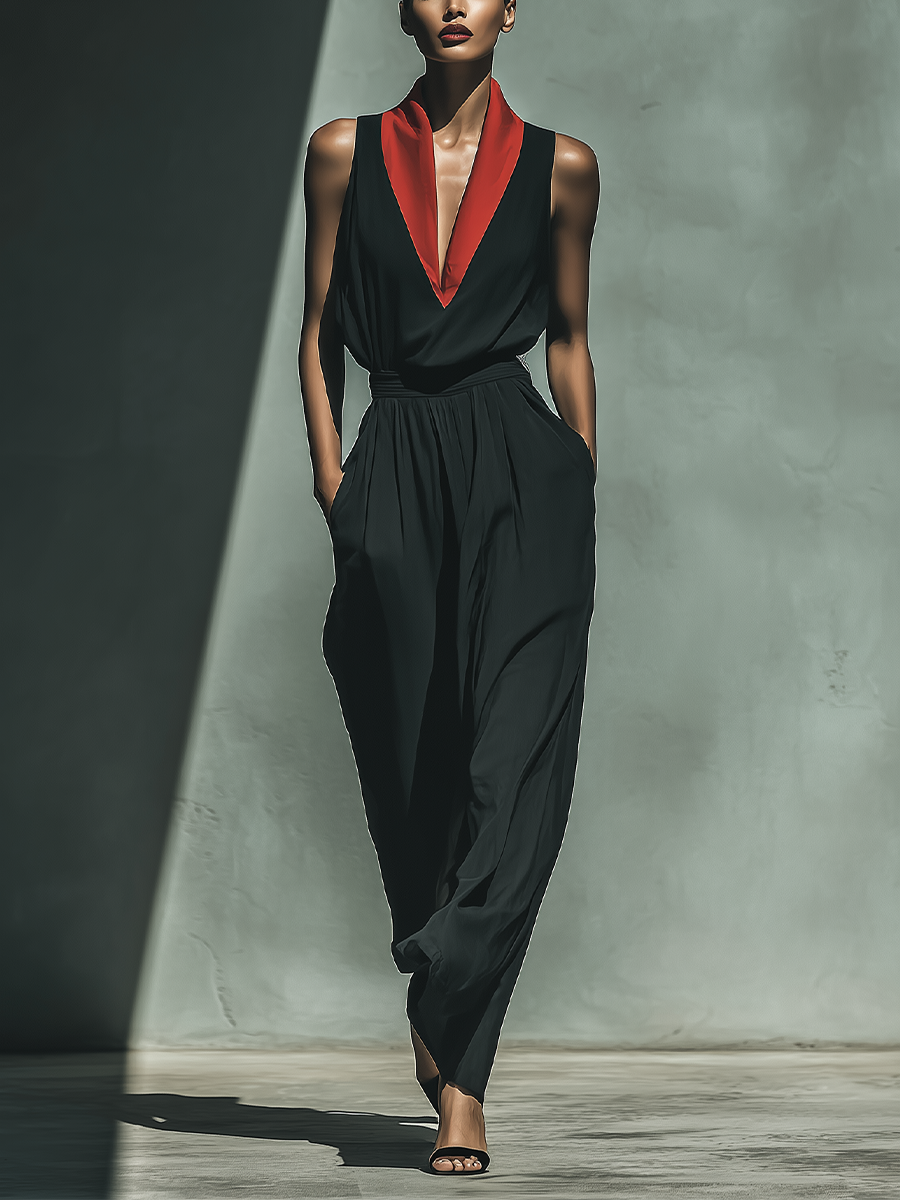 Women's Black Chiffon Sleeveless Jumpsuit With Red Contrast V-Neck Collar & Wide-Leg MDZ0965A8T
