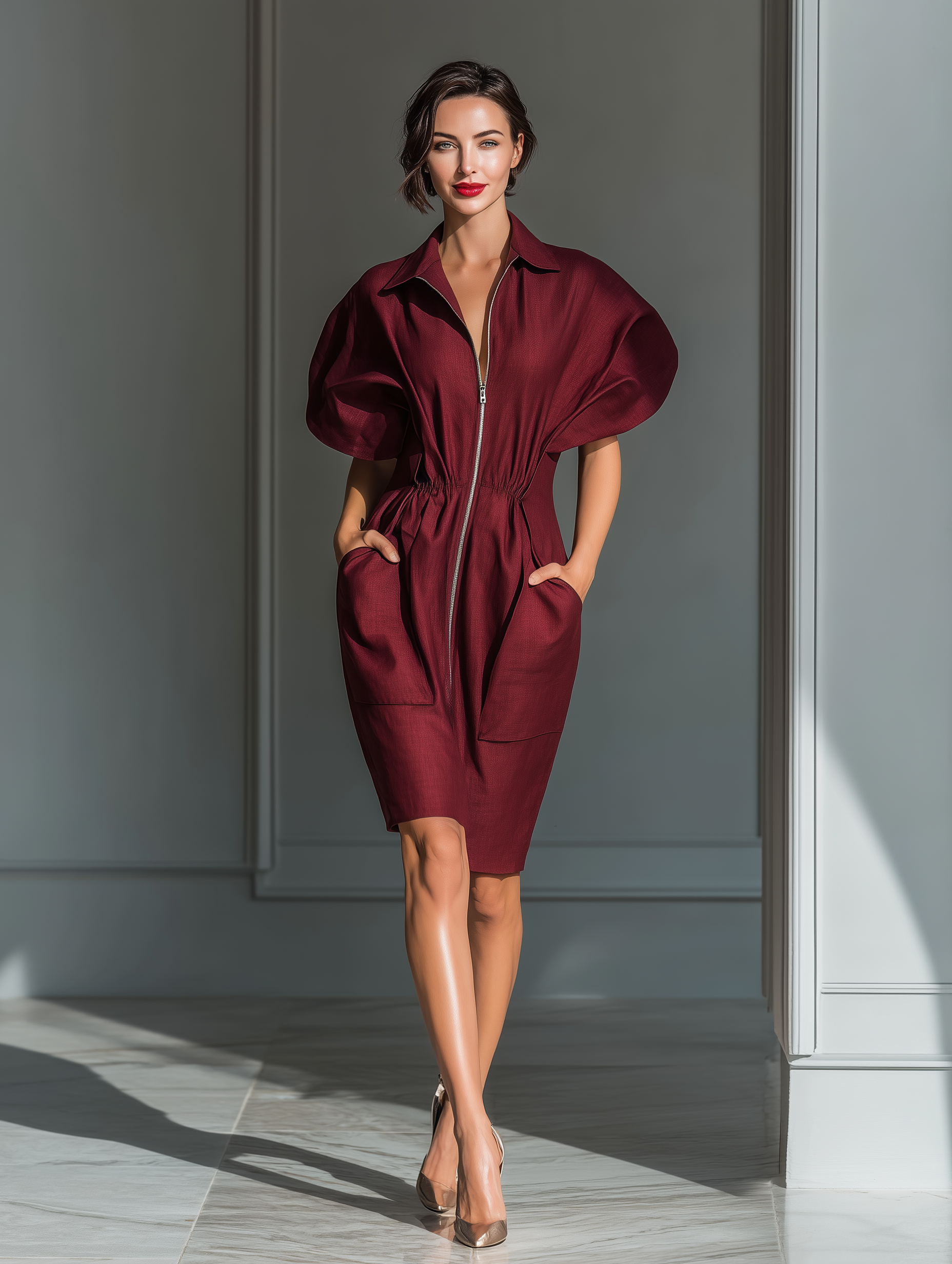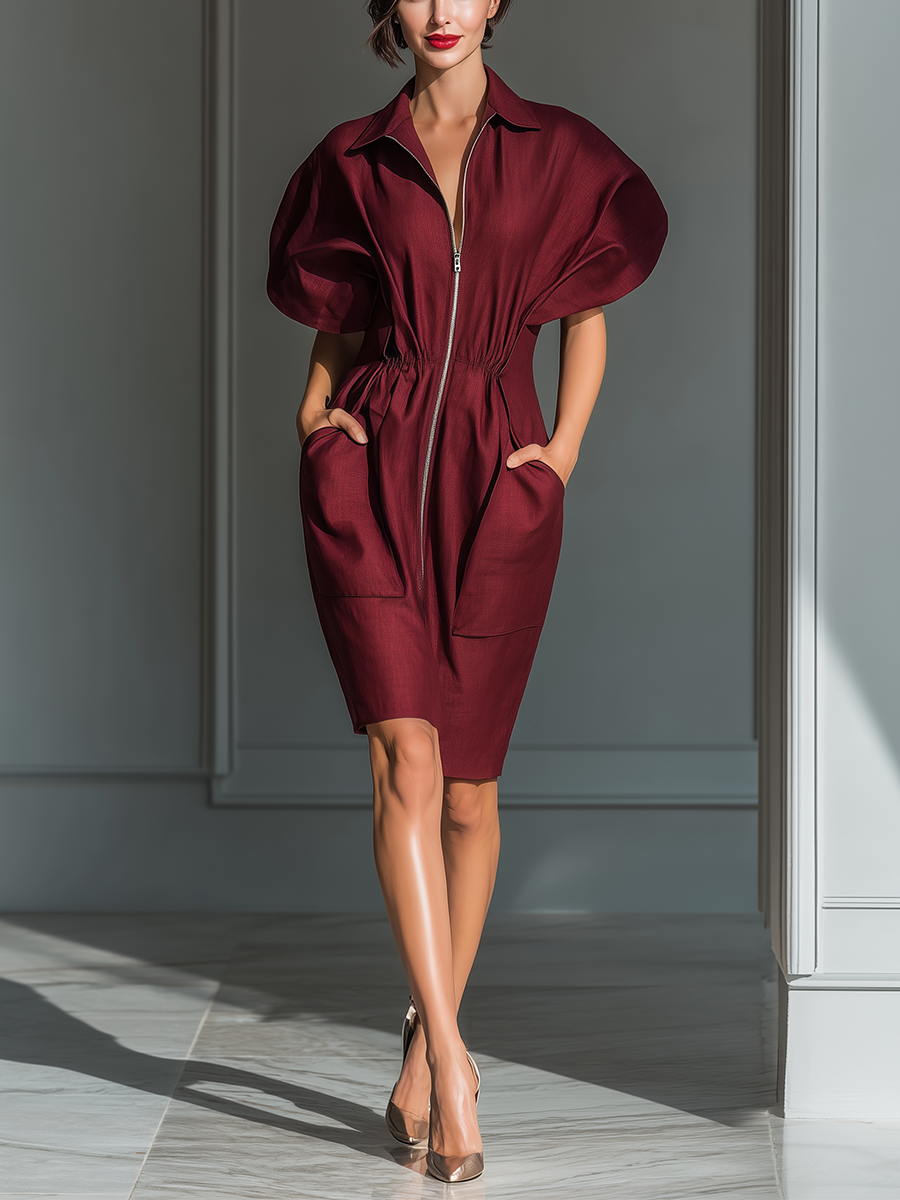 Women's Burgundy Cotton Blend Zip-Front Shirt Dress With Batwing Sleeves & Patch Pockets MDZ2782B0T