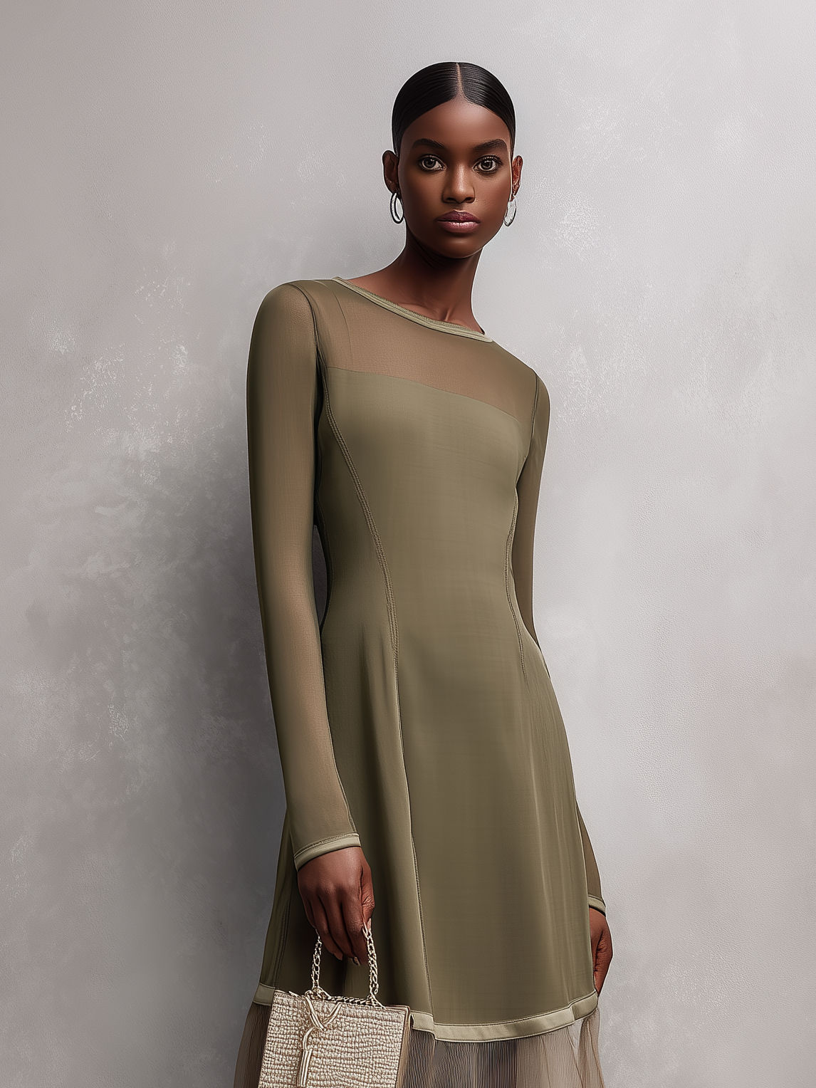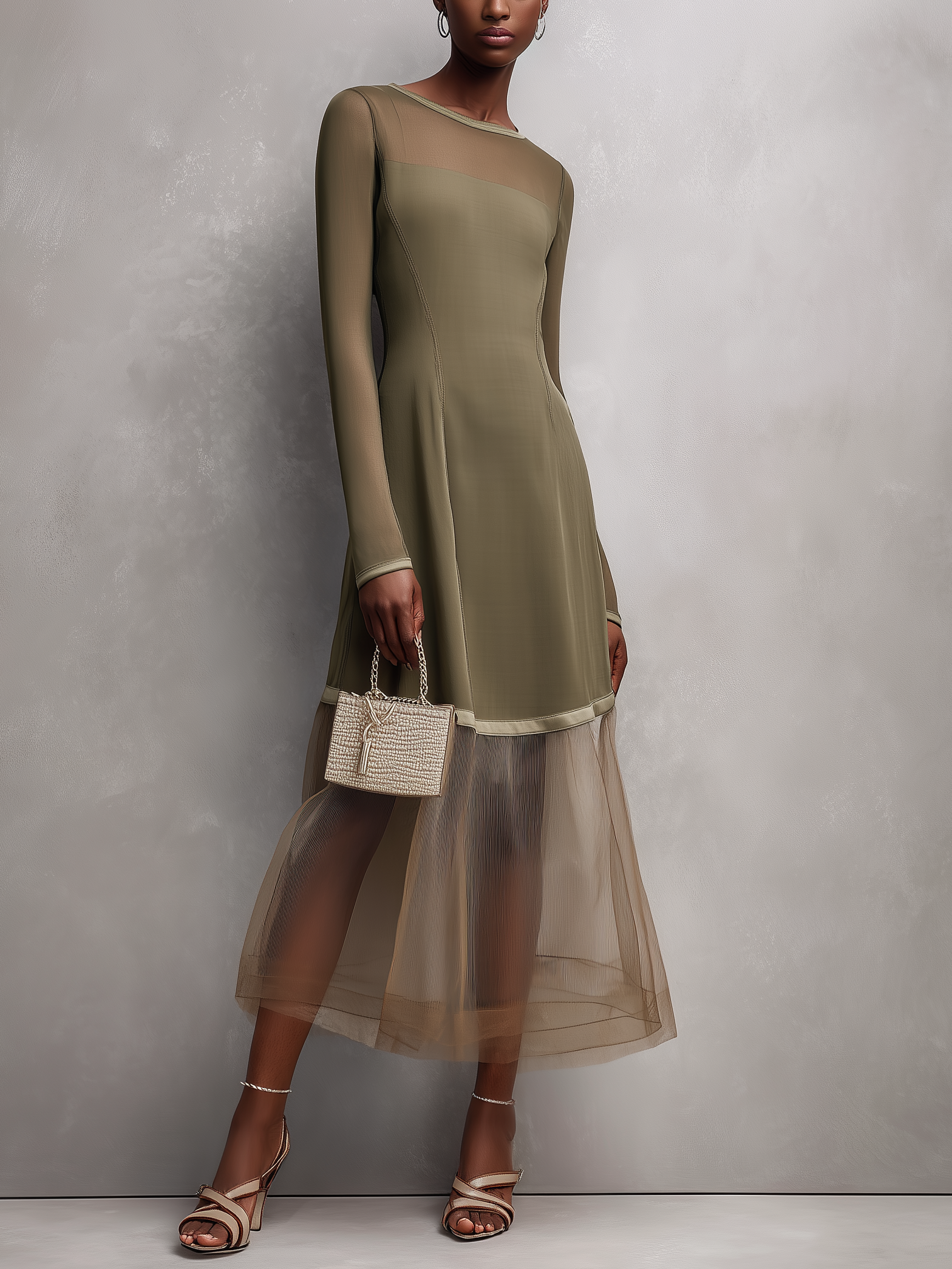 Women's Elegant Gray-green Round Neck Long-sleeved Slim-fit Stretch Knit Midi Dress MDA2329L4AN