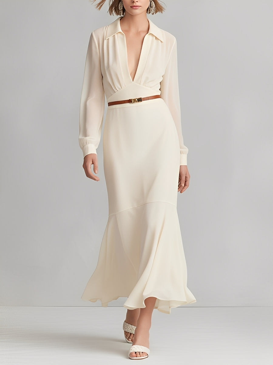 Women's Ivory Flowy Dress With Deep V-Neck & Mermaid Hem, Modern Sophisticated Style Dress (without Belt) MDA2464L1I