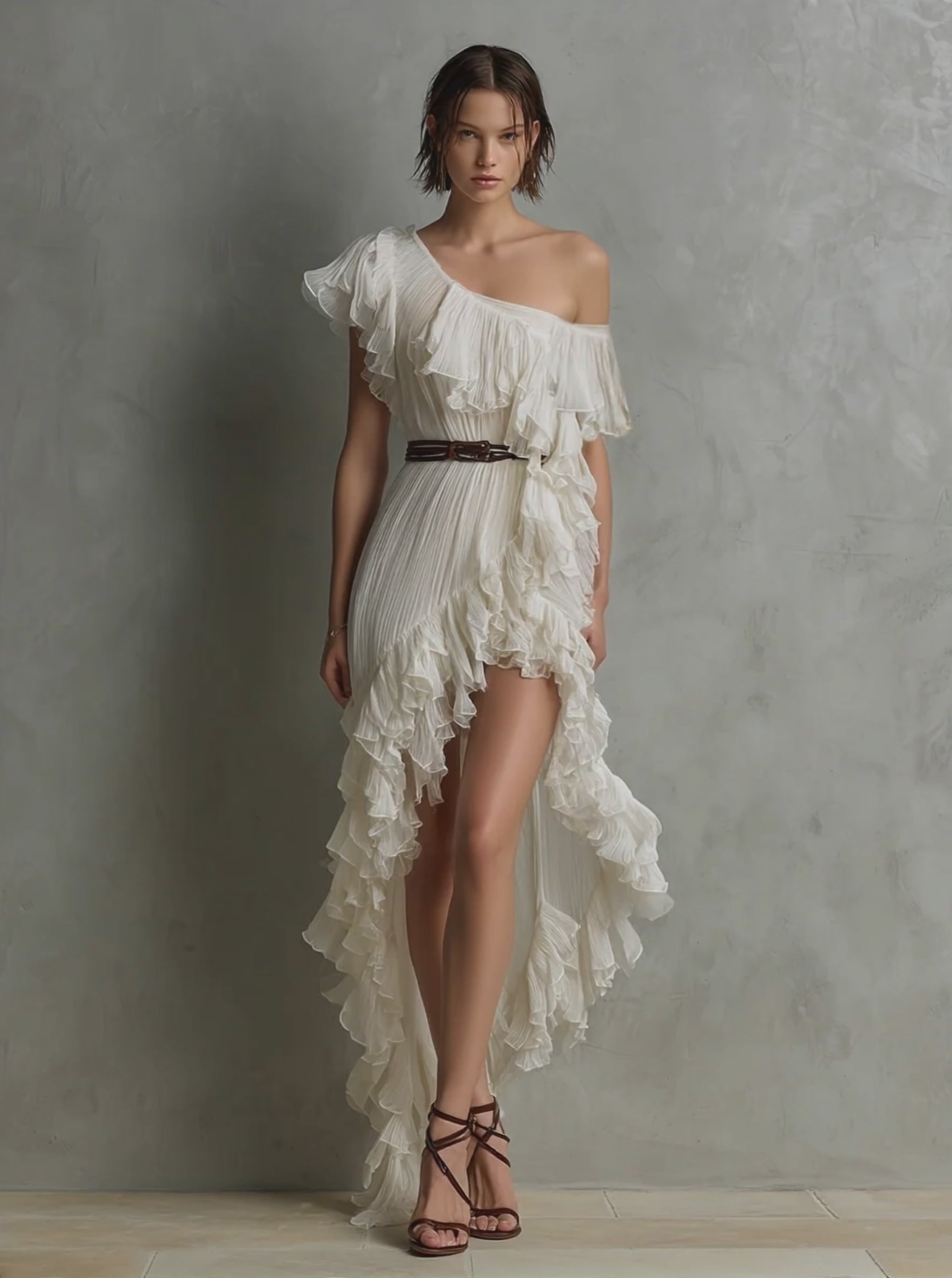 A white chiffon dress with a one-shoulder neckline and ruffled trim. It offers a timeless romantic-elegant look with an asymmetrical high-low hem.
