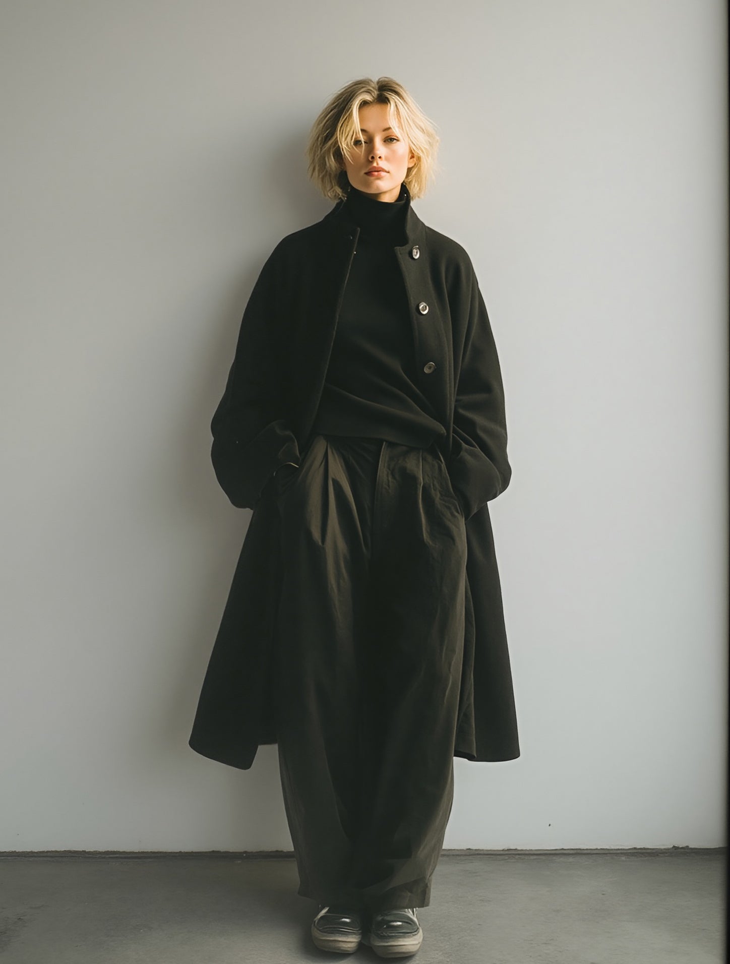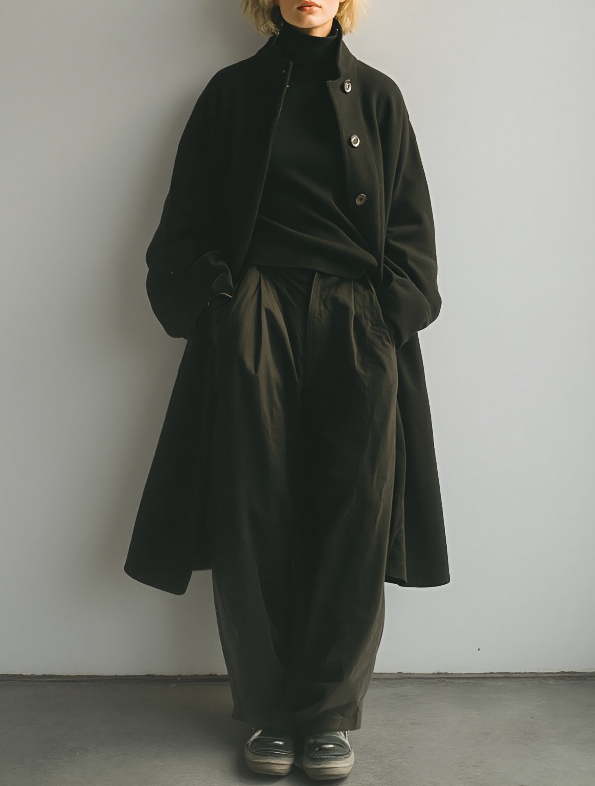 Women's Minimalist Vintage Style Black Single-breasted Mid-length Wool Coat MDA0876K0AN