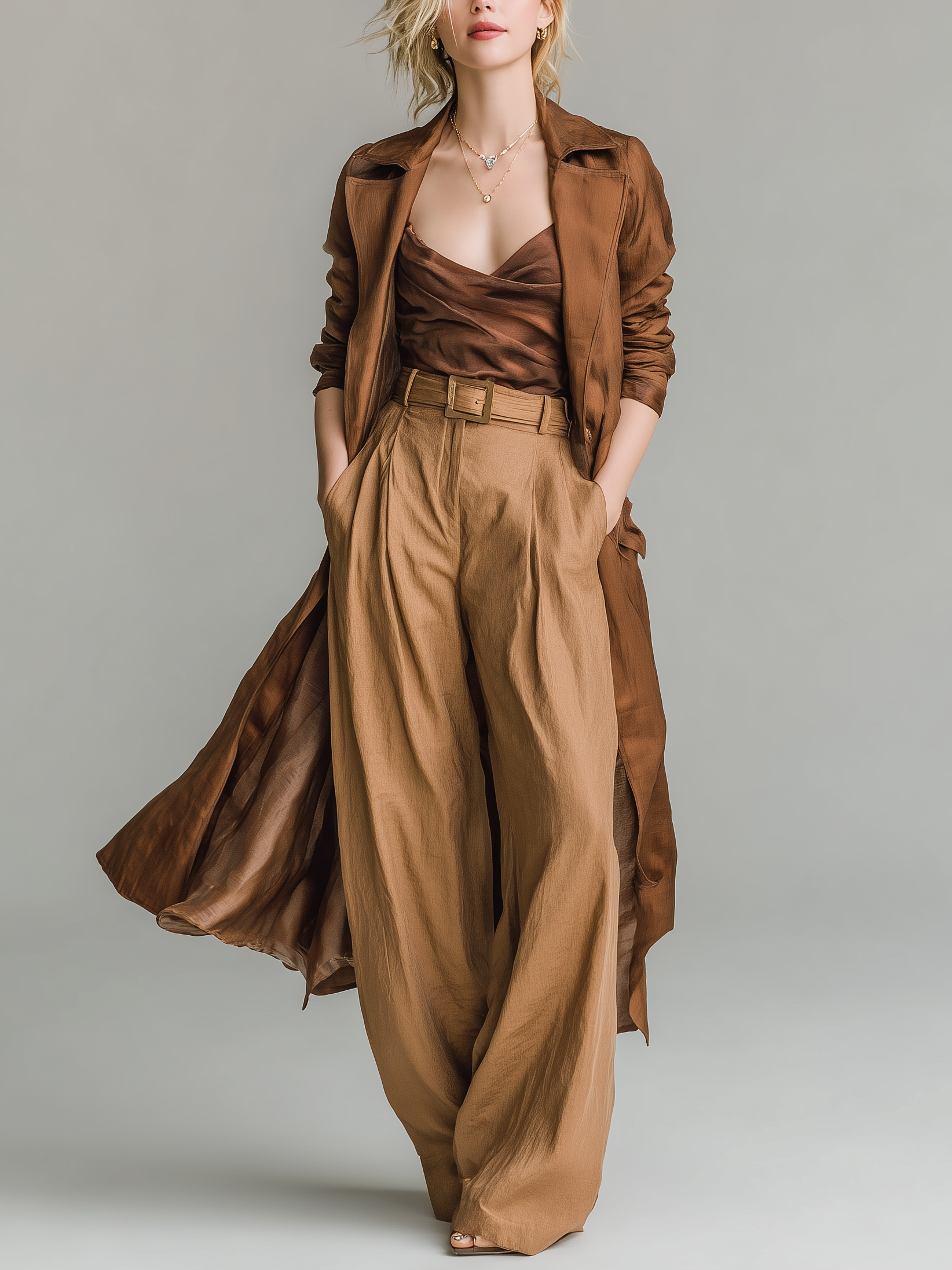 Women's Fashionable And Elegant Brown Glossy Satin Long-sleeved Trench Coat MDA2752K8AN