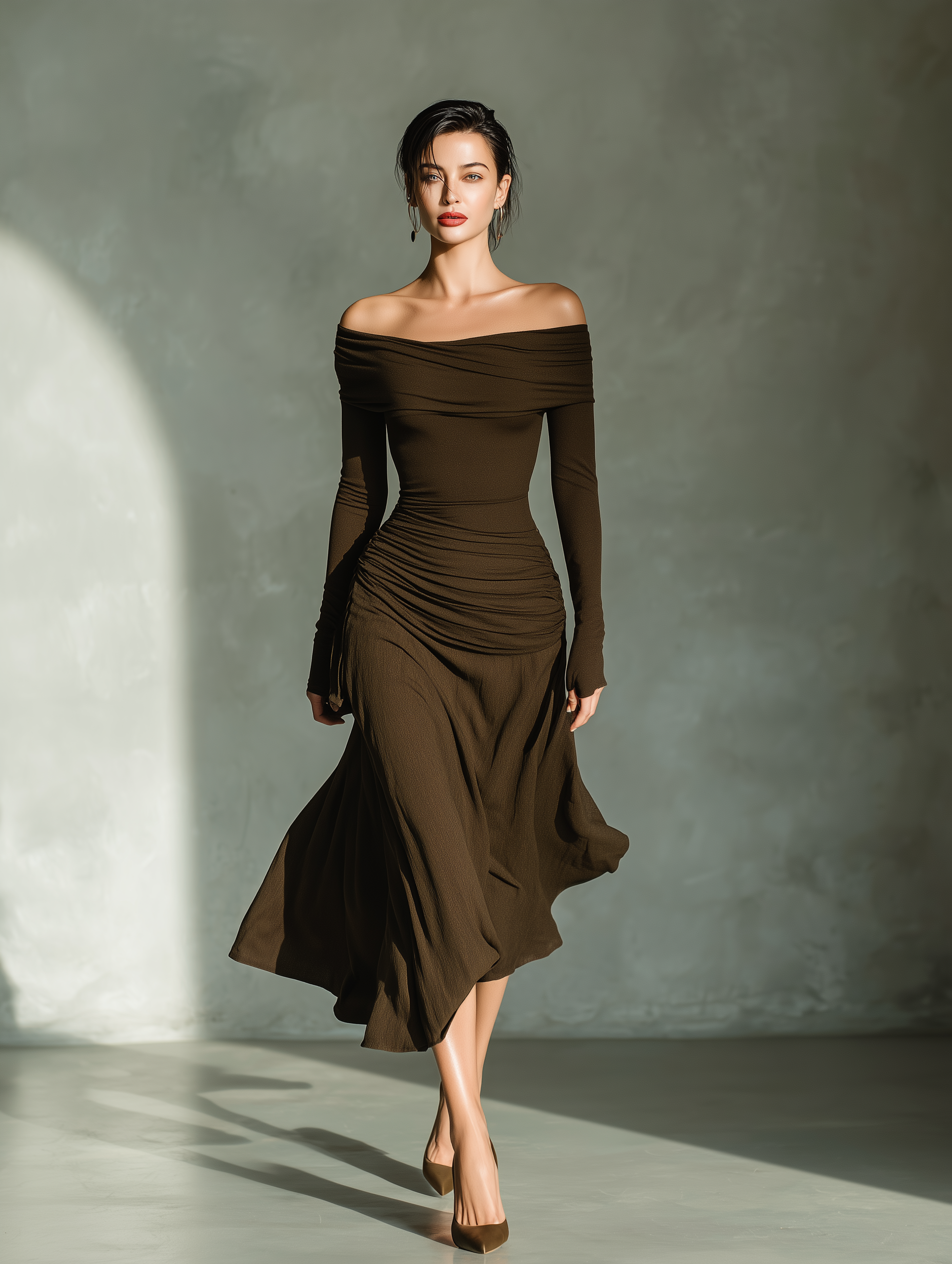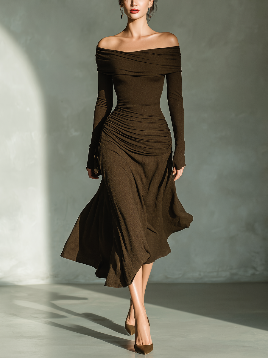 Women's Chocolate Brown Stretchy Knit Off-the-shoulder Pleated Midi Dress MDA1266L7T