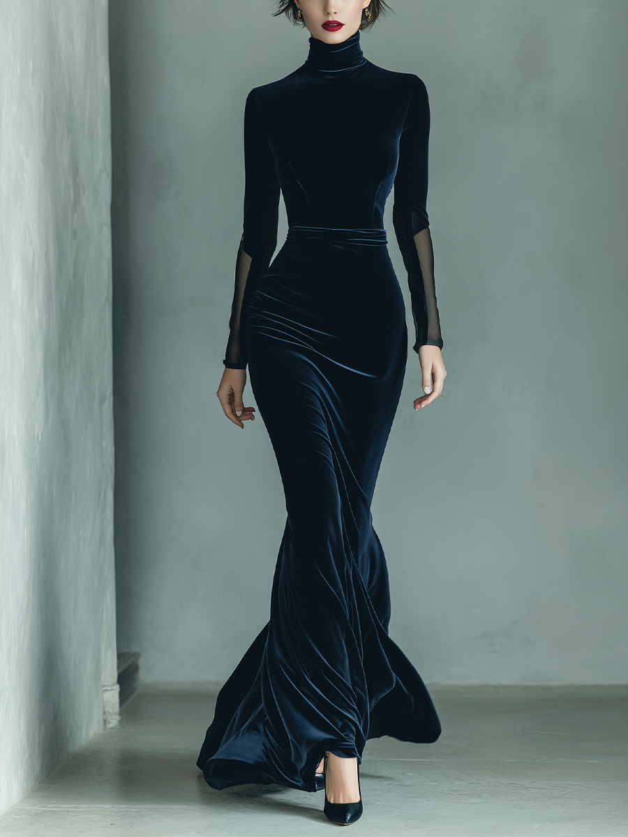 Women's Navy Blue Velvet Fabric Turtleneck Sheer-Sleeve Mermaid Maxi Dress MDA1227L3T