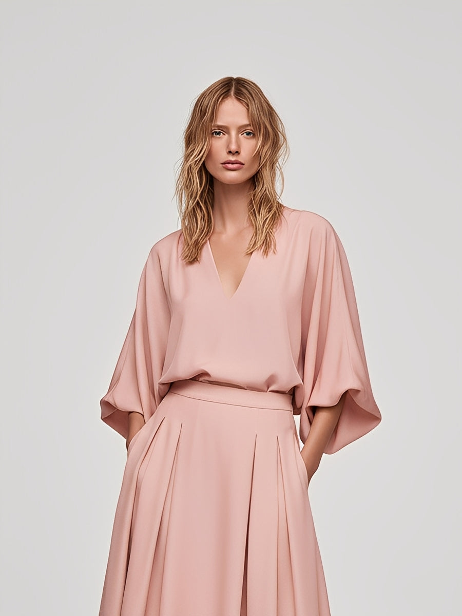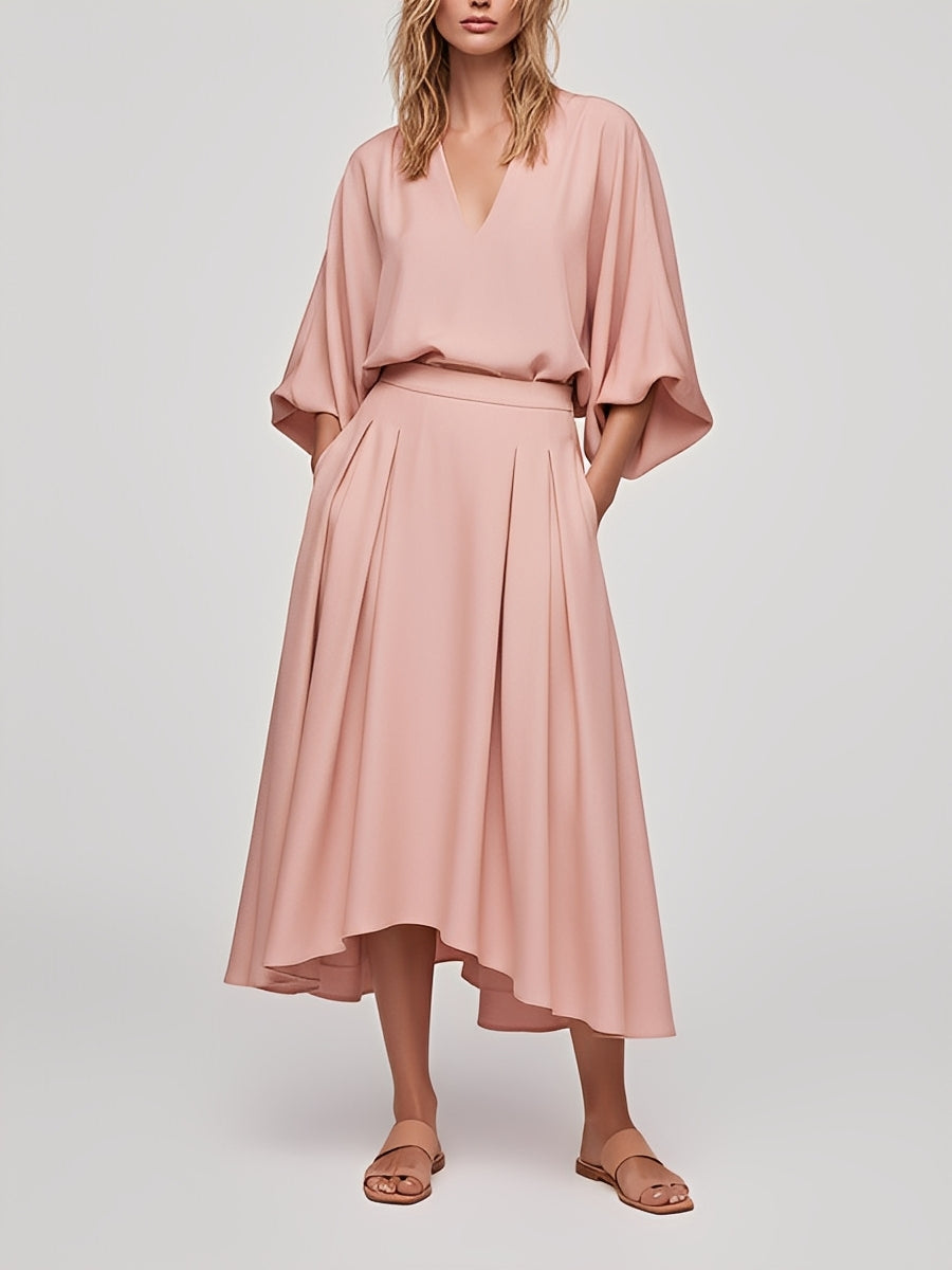 Women's Pink Cotton Matching Set With Deep V-Neck & Asymmetric Hem, Modern Elegant Style Set MDA1043L4I