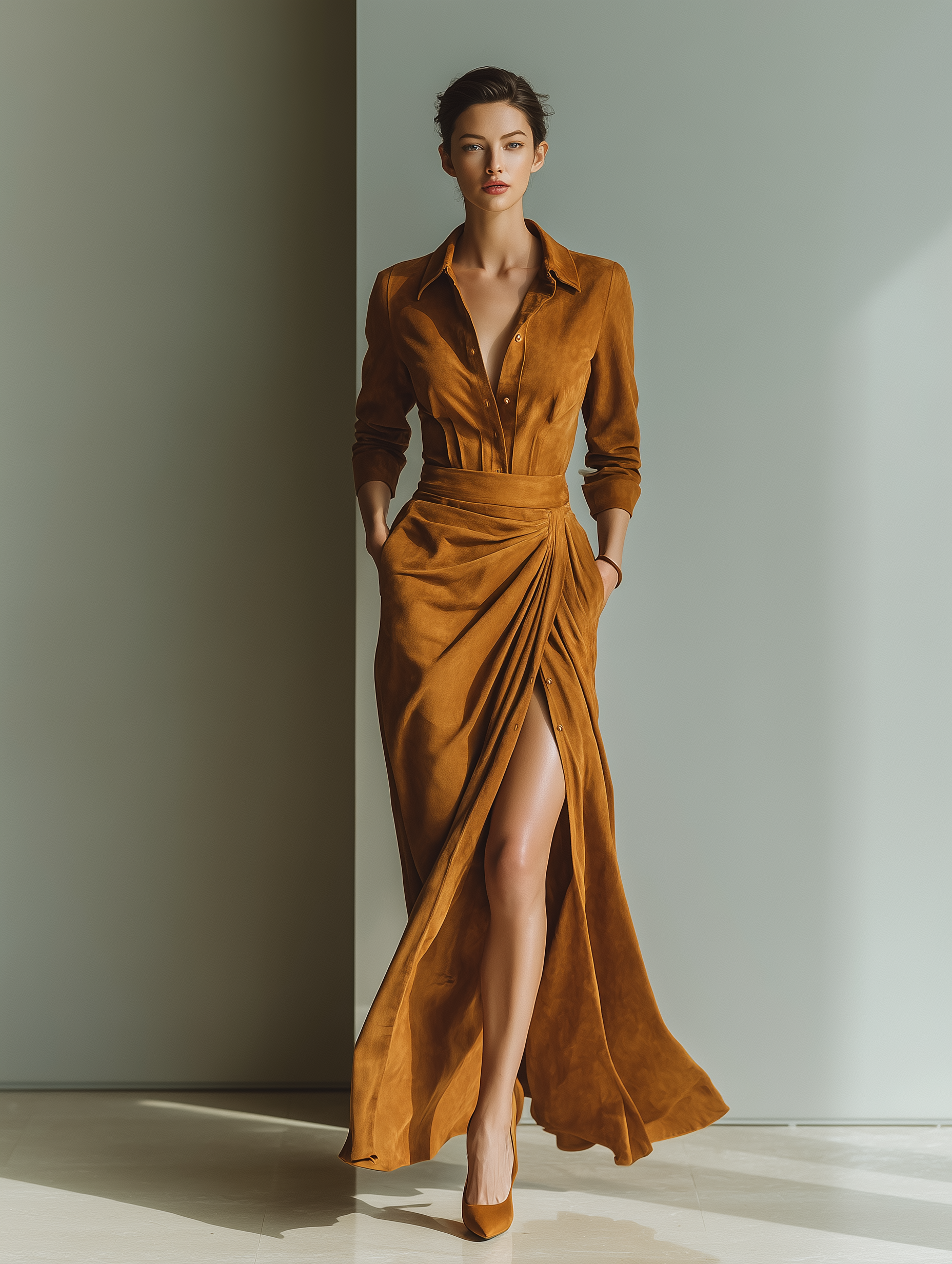 Women's Tan Faux Suede Fabric Collared Button-Front Top & Ruched Slit Maxi Skirt Set MDA1238L7T