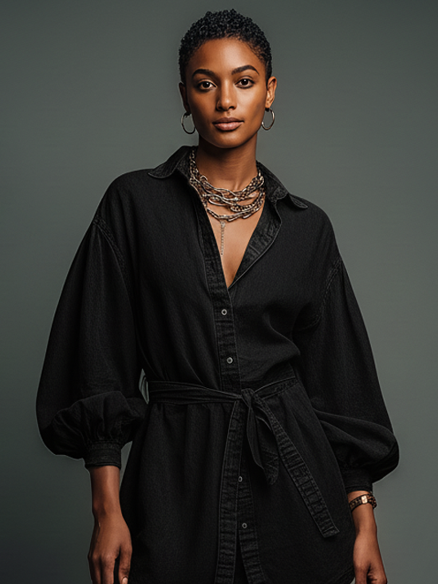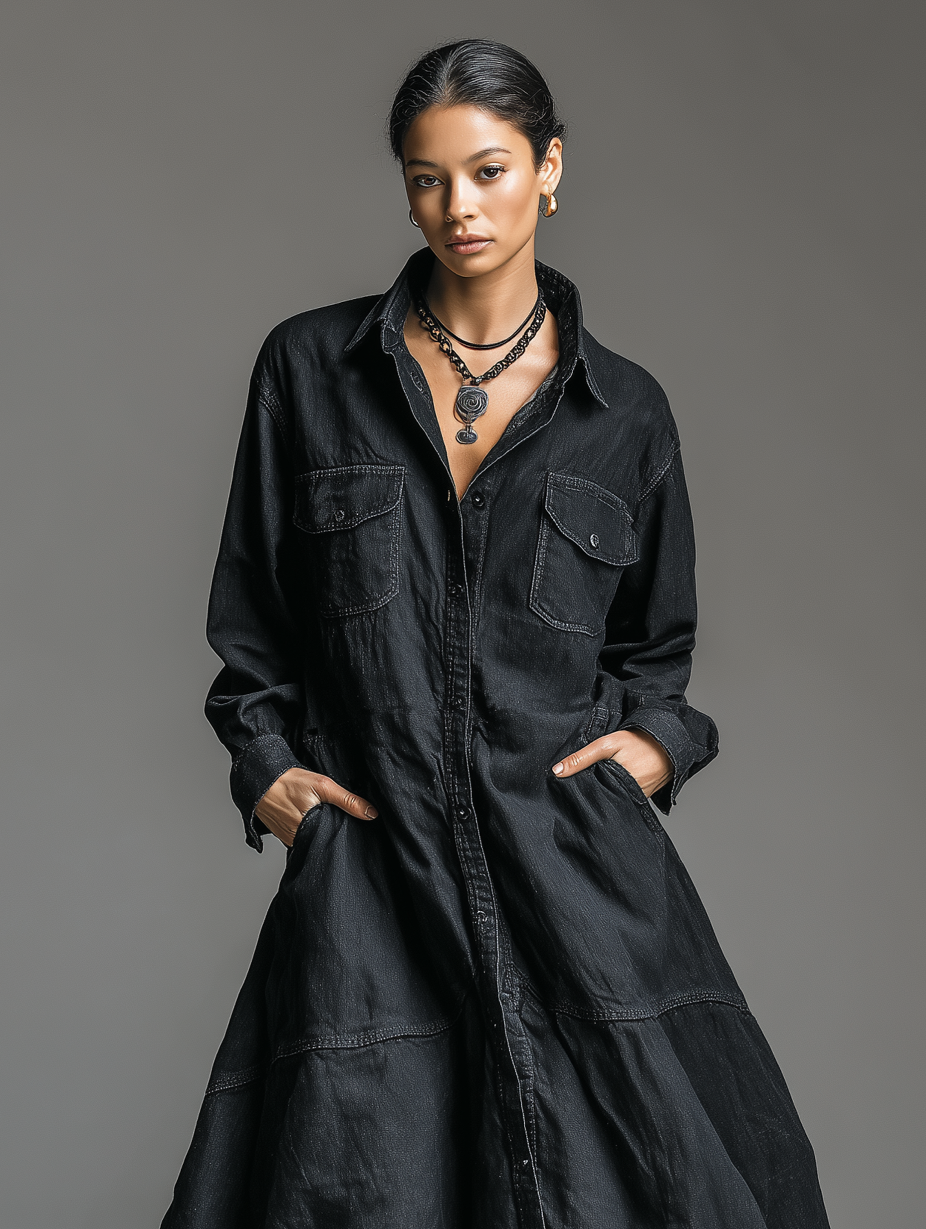 Women's Minimalist Loose-fitting Black Denim Shirt Mini Dress MDA2443K3Y