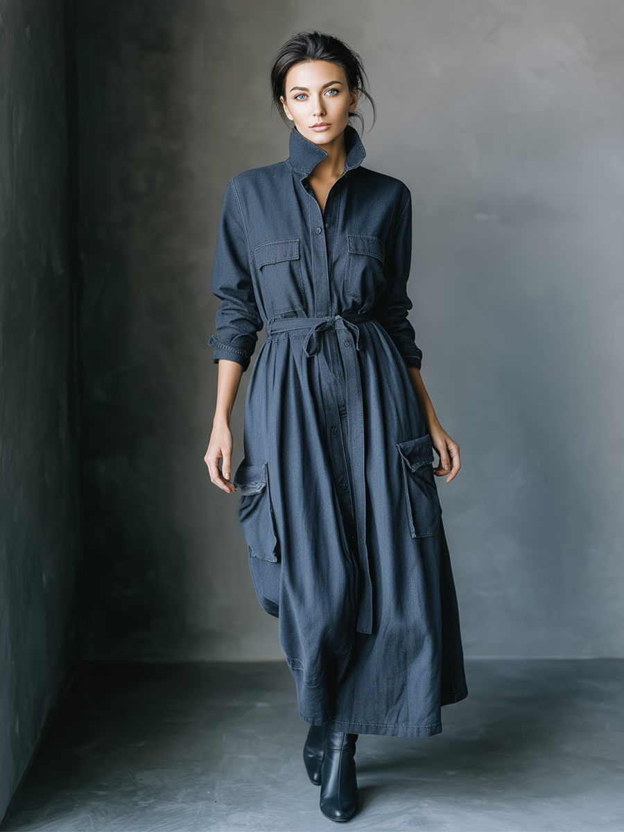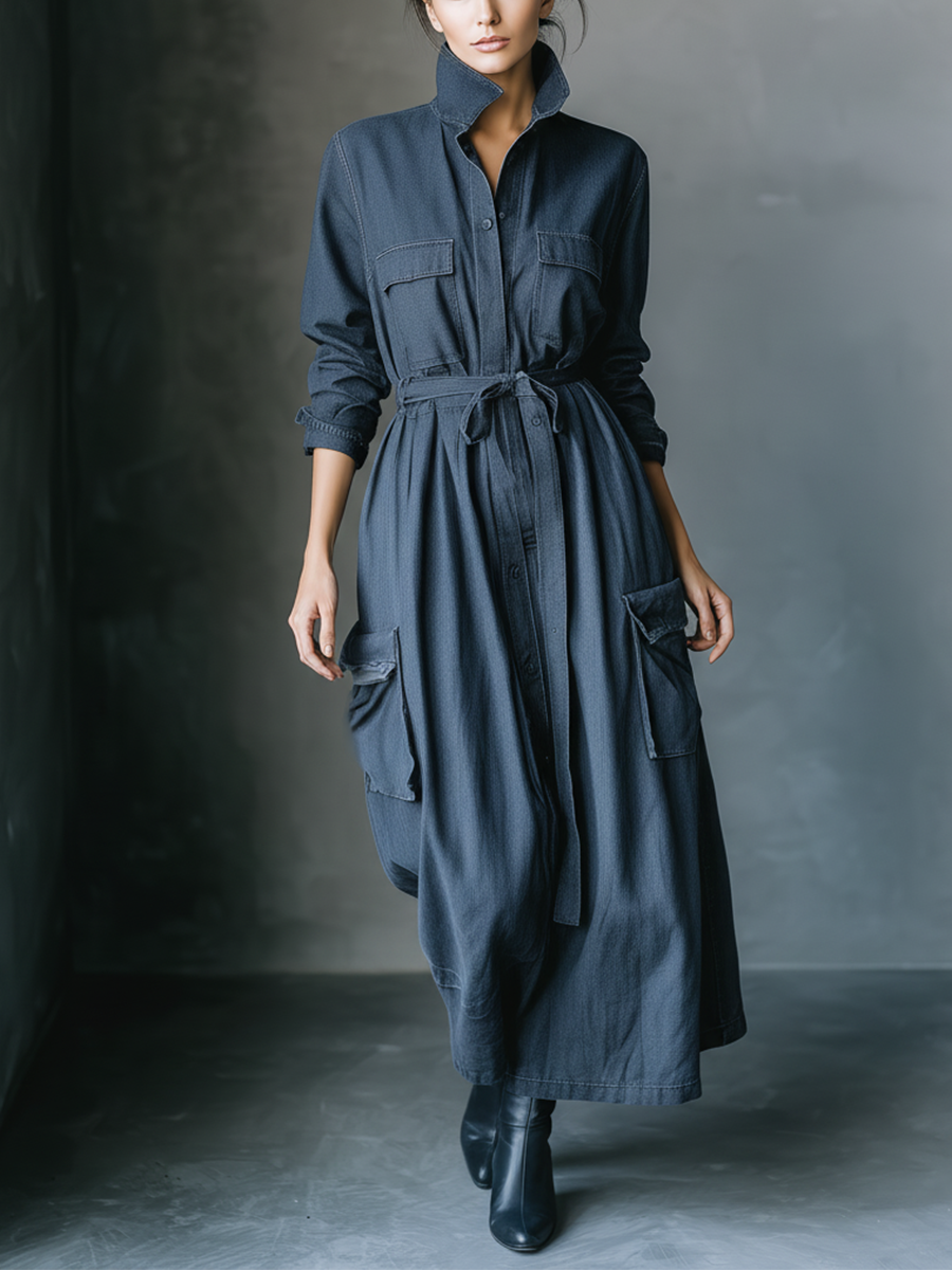 Women's Dark Gray-blue Denim Multi-pocket Tie-up Workwear Dress MDA2479K9T