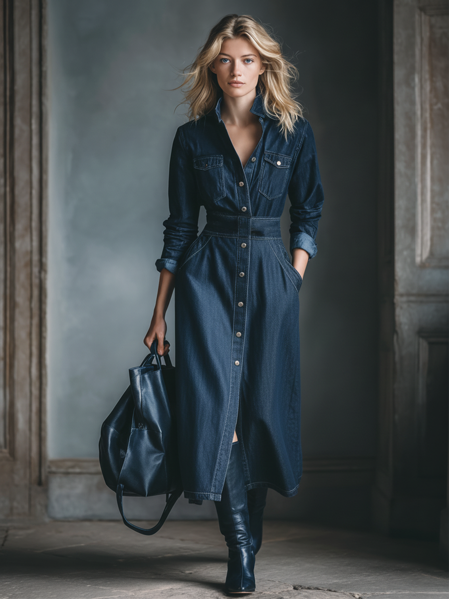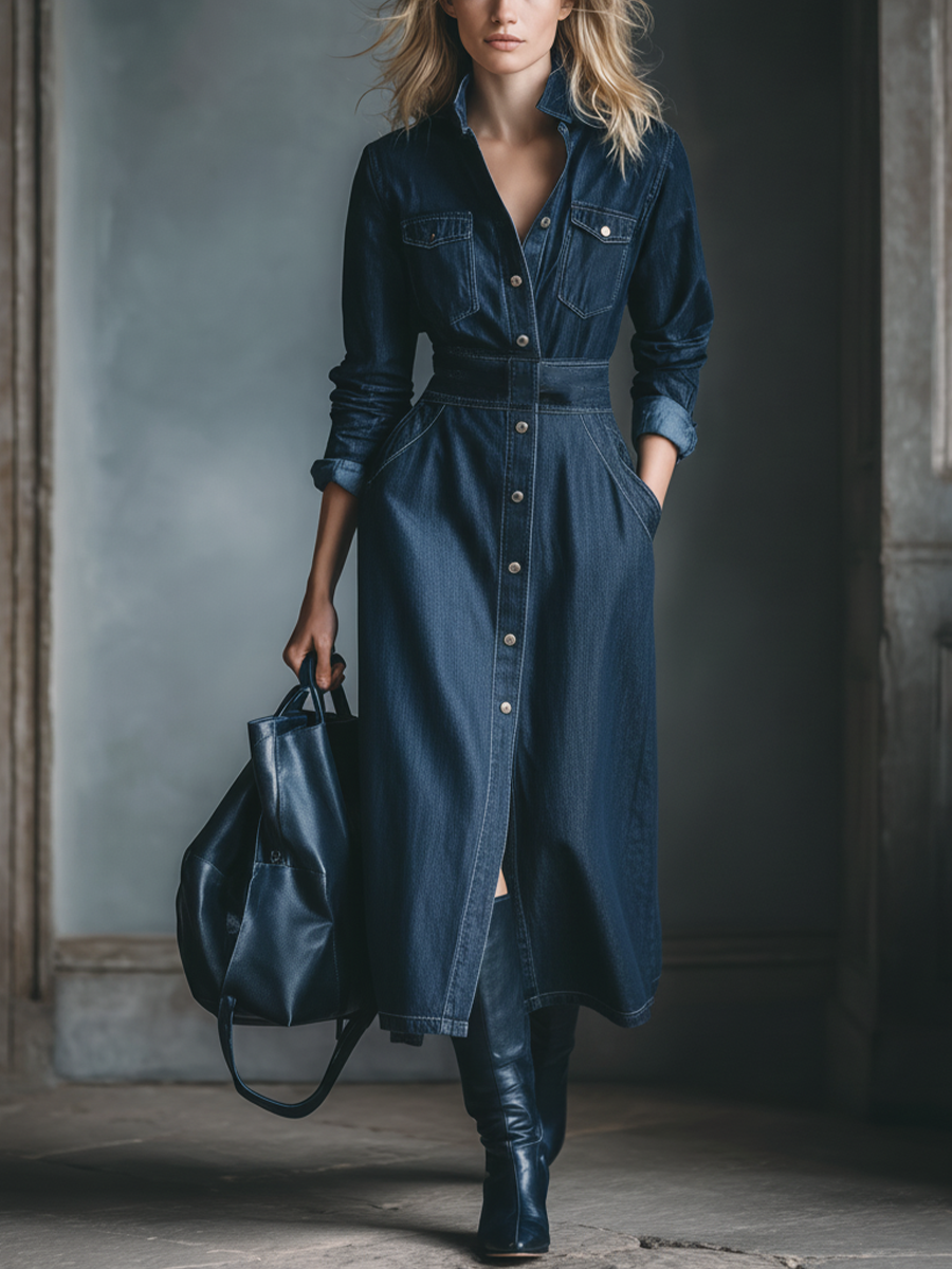 Women's Deep Indigo Denim Long-Sleeved Fitted Waist Workwear Style Dress MDA1768K3T