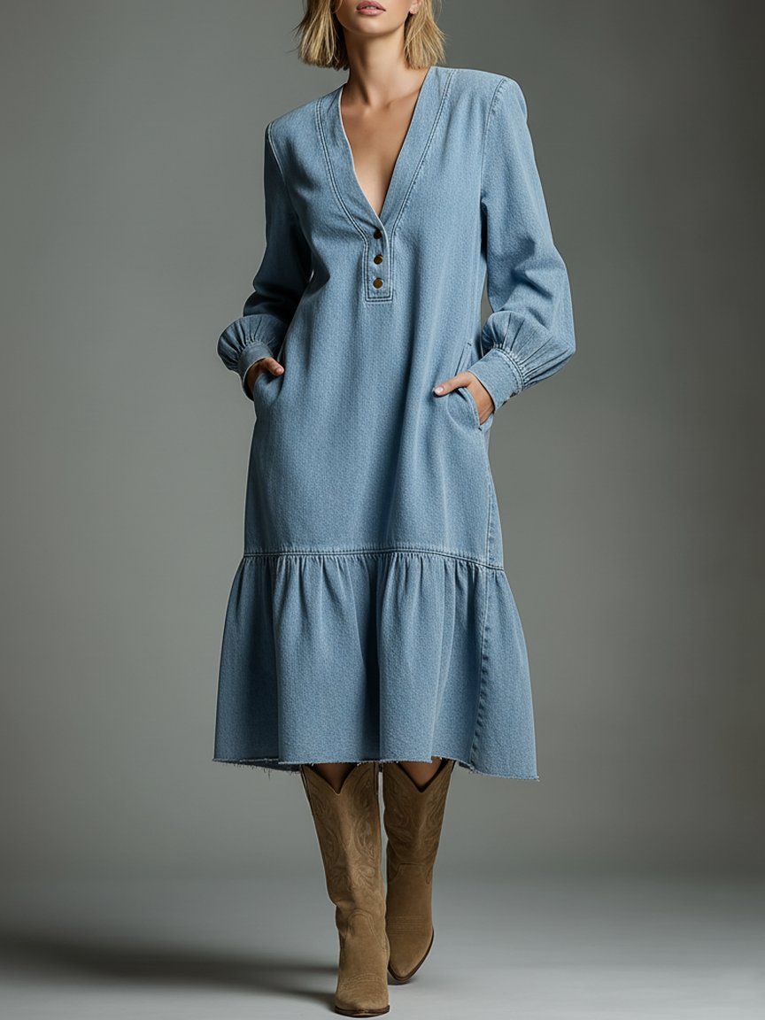 Women's Loose-fitting Washed Denim Button-down V-neck Long-sleeved Midi Dress MDA1430K6Y