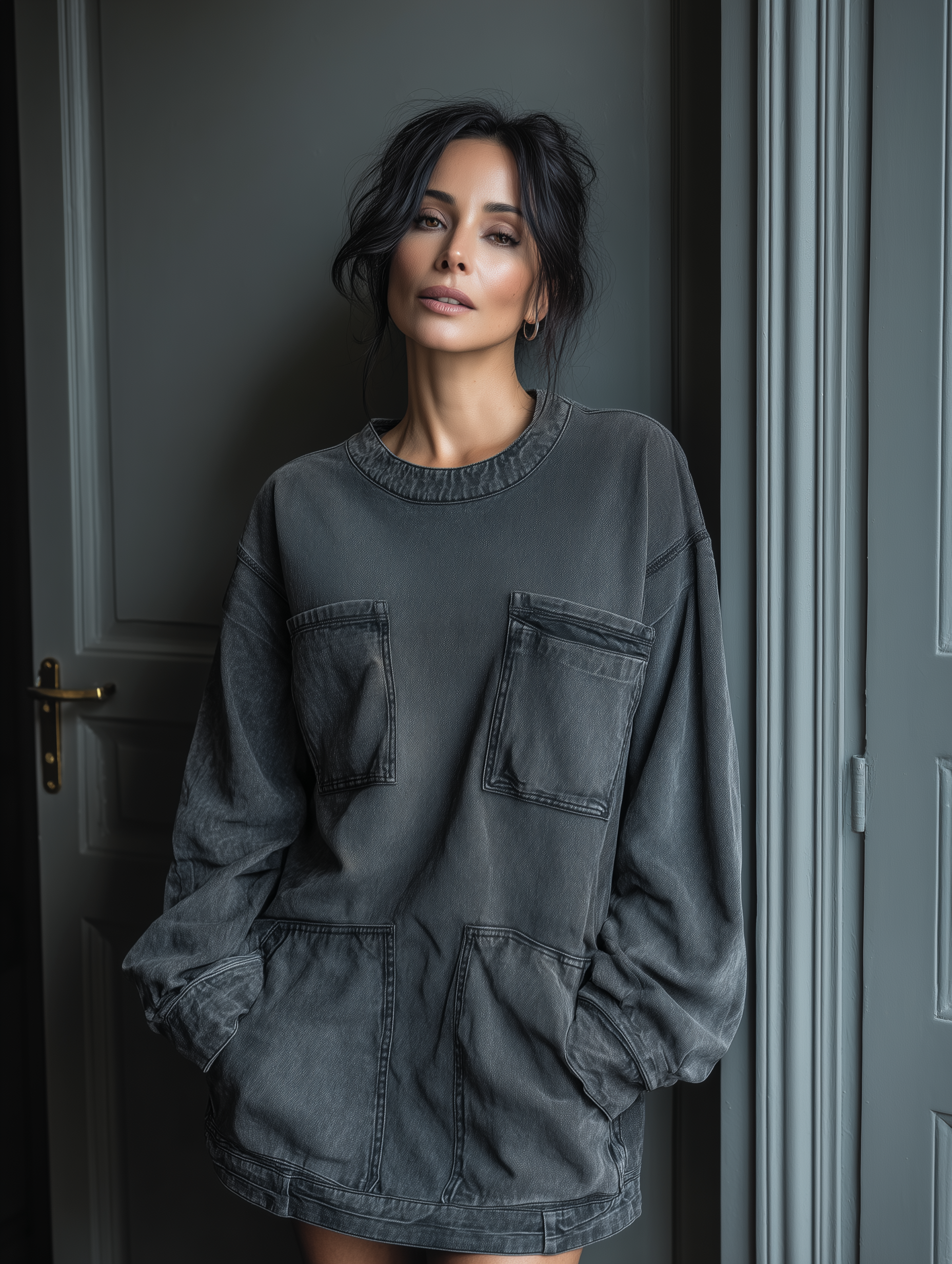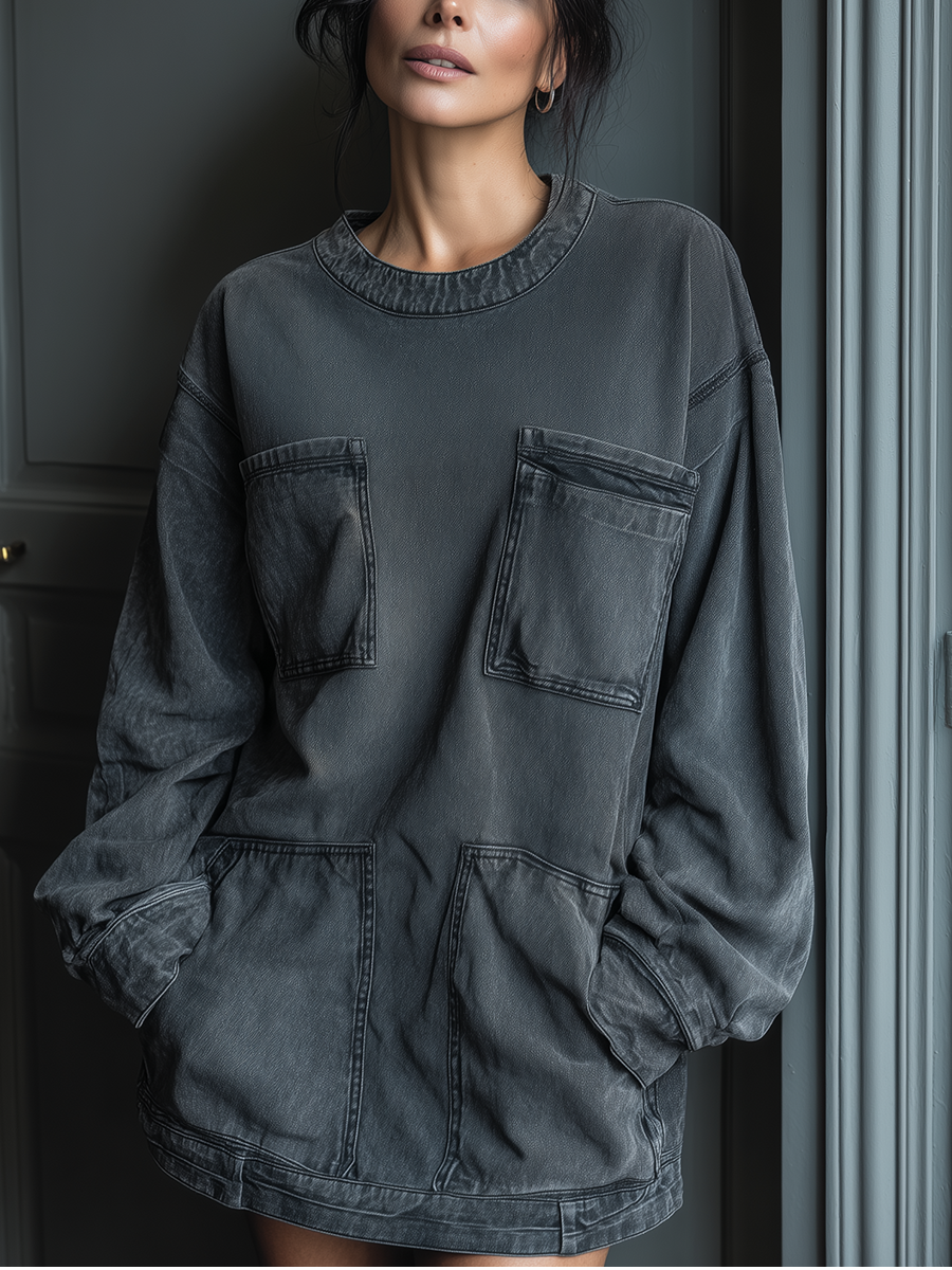 Women's Charcoal Gray Denim Cargo Pocket Long-sleeved Mini Dress MDA2449K9T