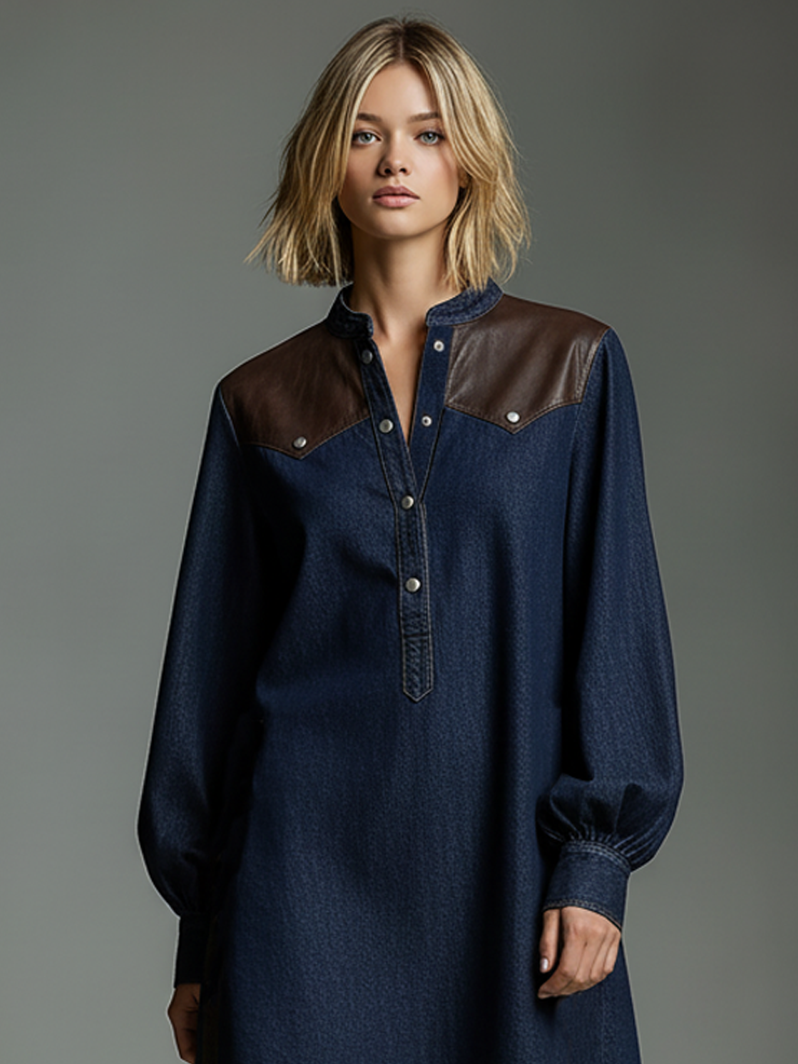 Women's Loose-fitting Denim And Faux Leather Patchwork Mini Dress With Button-up Collar MDA1310K4Y