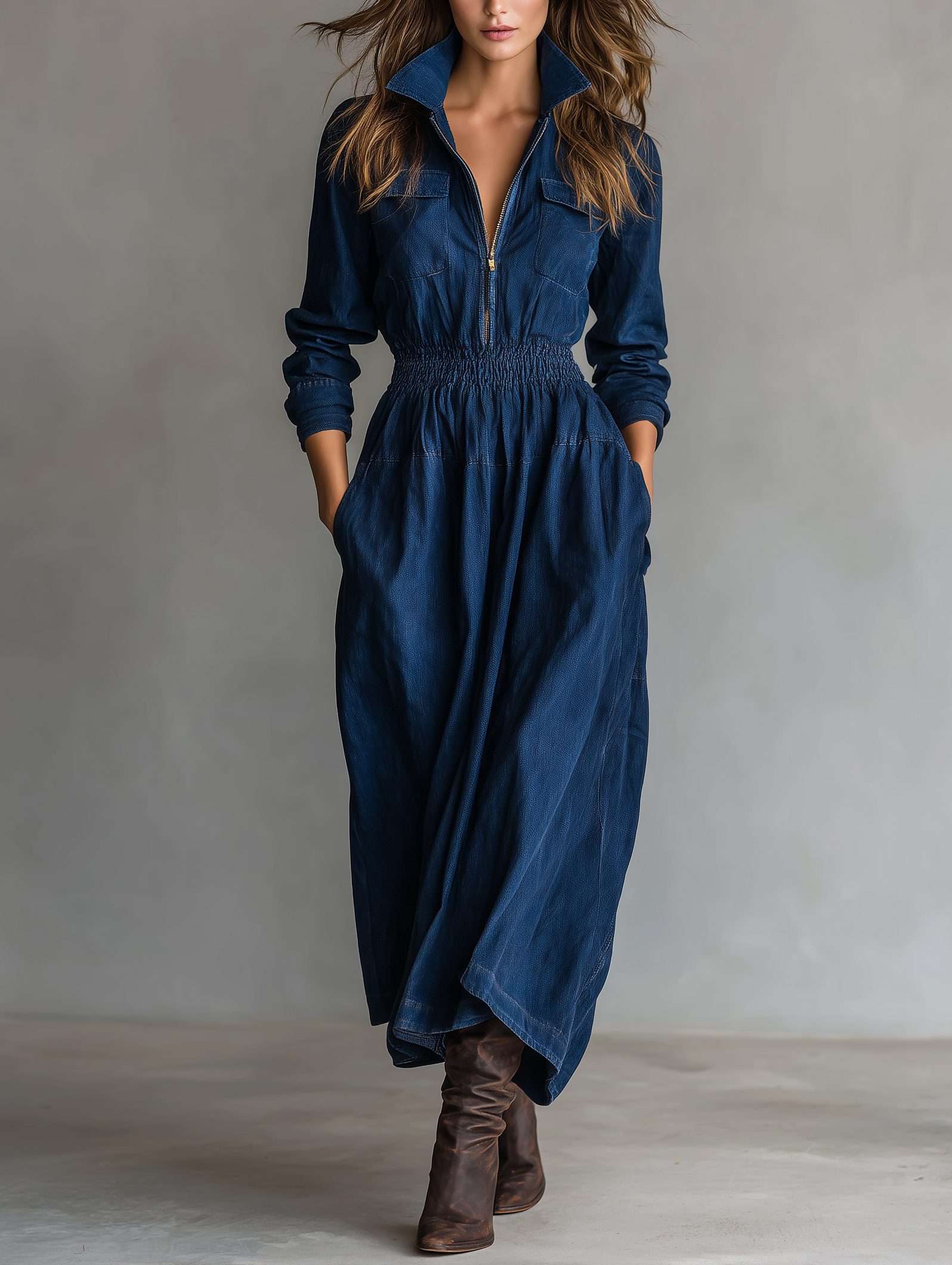 Women's Fashionable, Elegant, And Casual Washed Blue Denim Long Dress With Zip-up Neckline, Long Sleeves, Fitted Waist, And Chest Pockets MDA1888K0AN