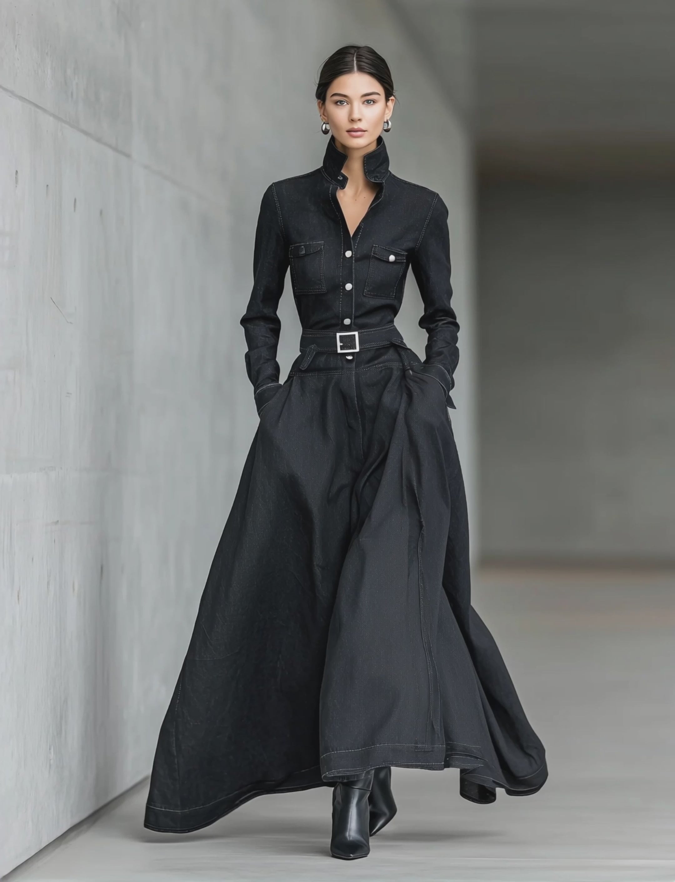 Women's Black Denim Collared Top And High-waisted Long Skirt Suit MDA2255K8T