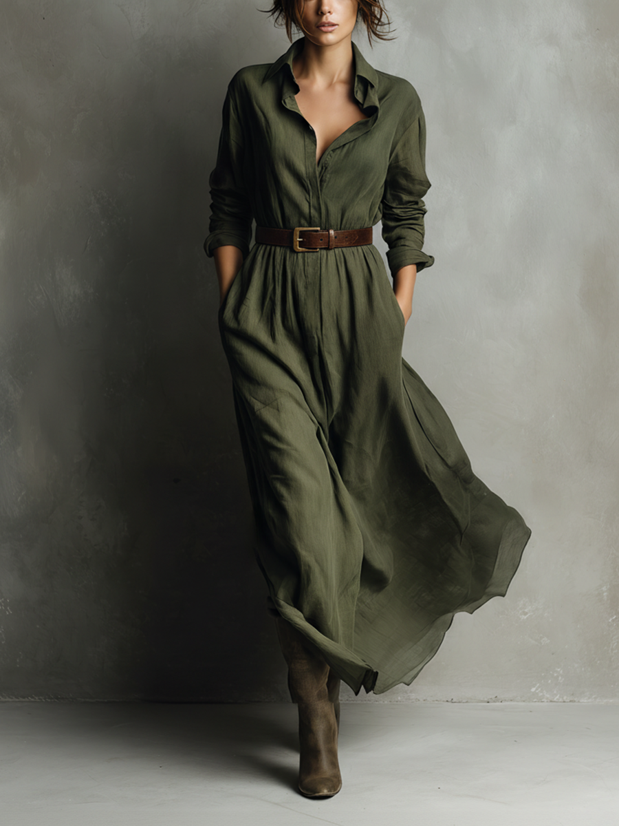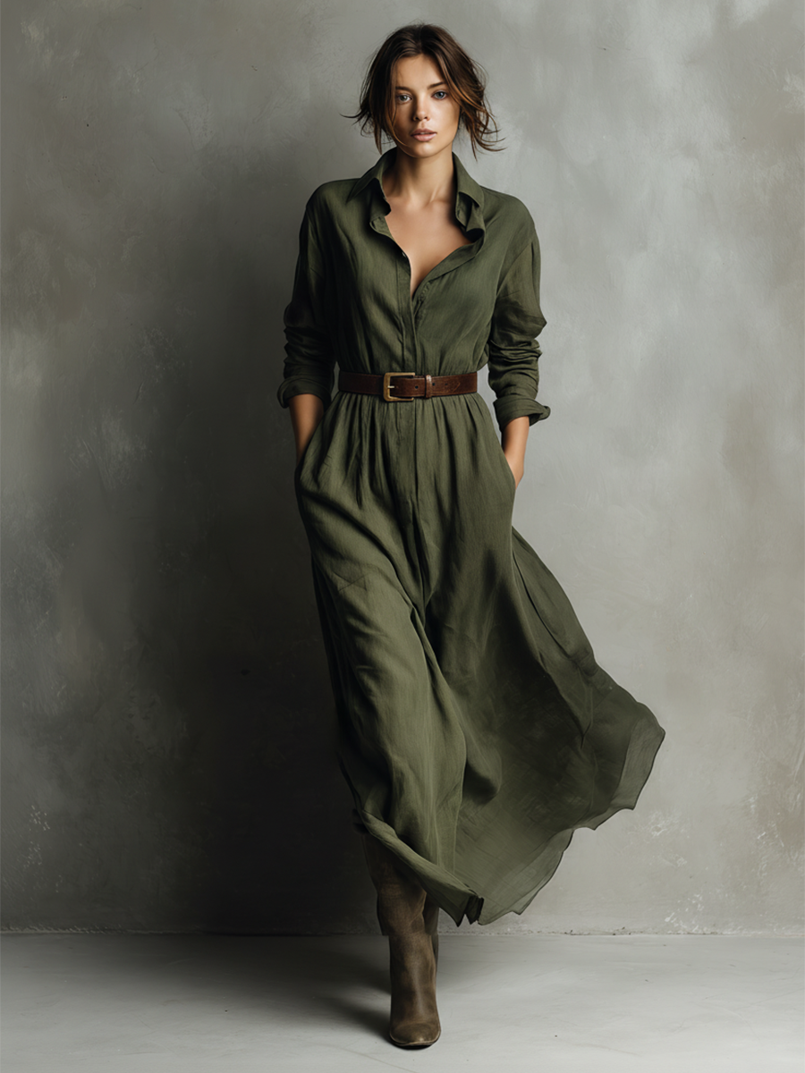 Women's Olive Green Cotton And Linen Blend Collared Long Dress With A Tie Waist MDA0877L8T