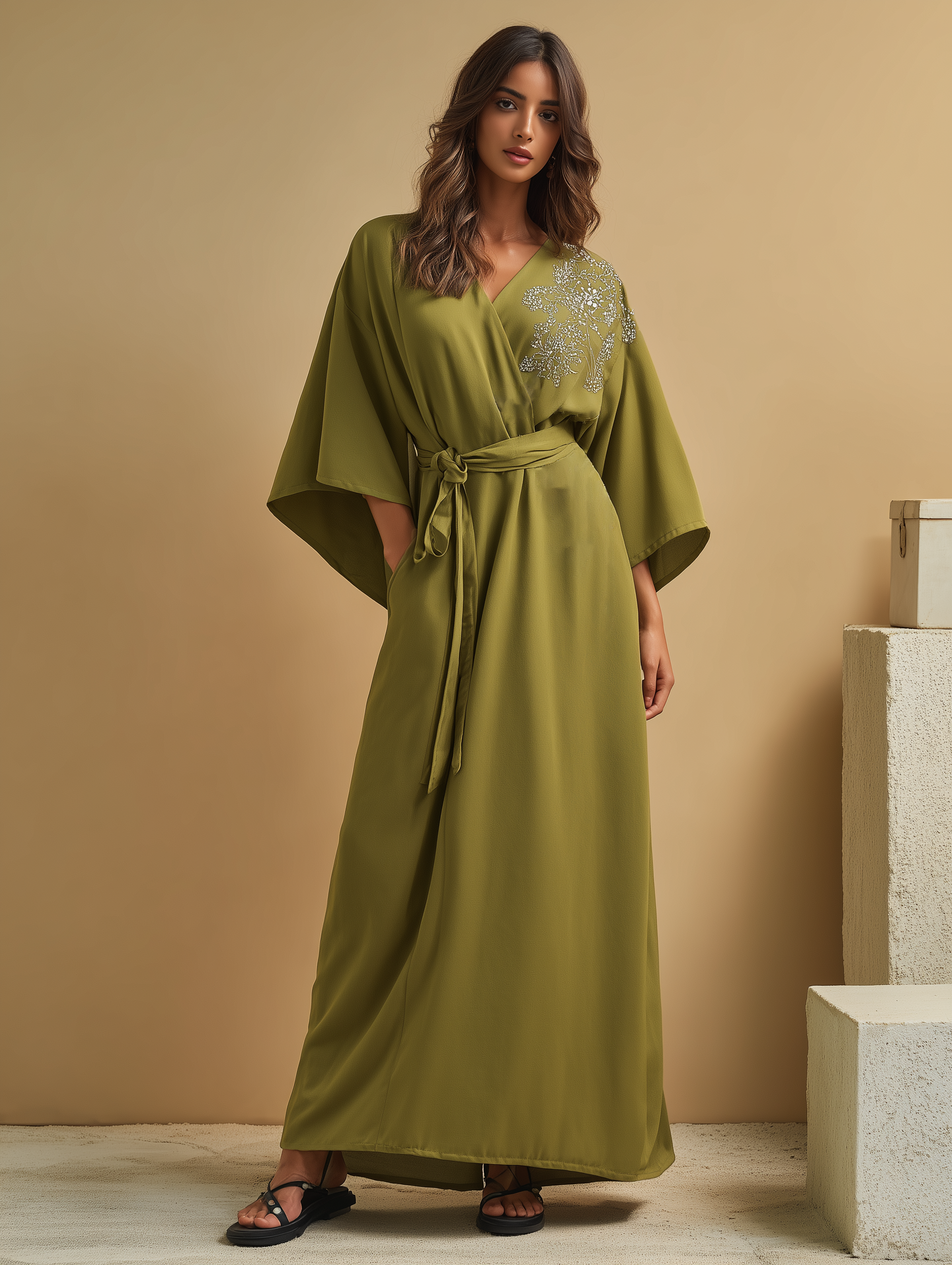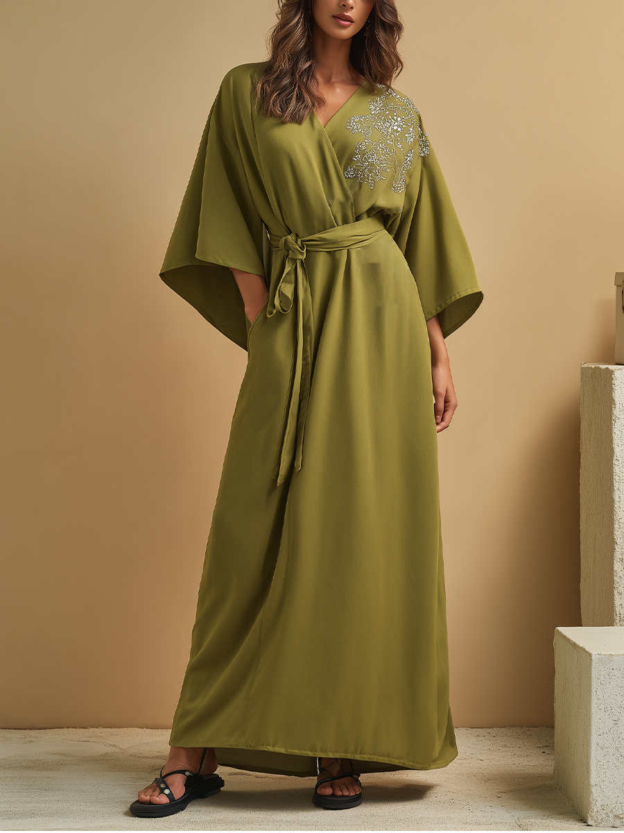 Women's Olive Green Chiffon Embroidered Tie-waist Long Dress MDA0512L5T
