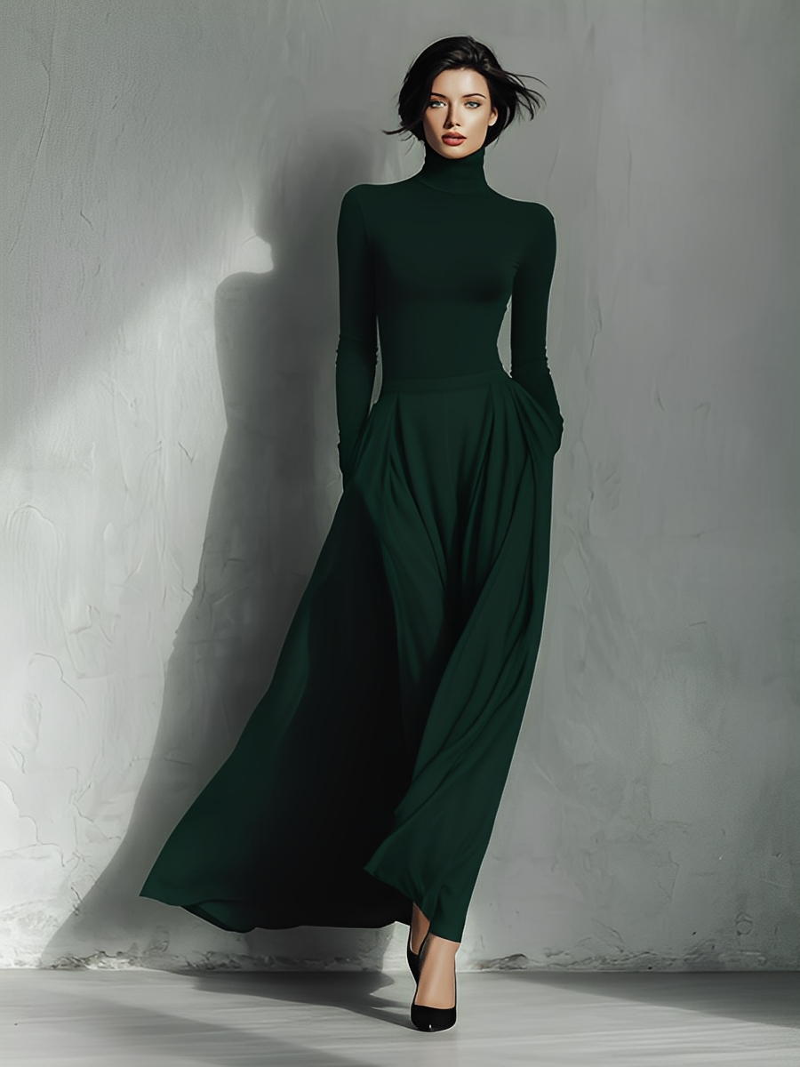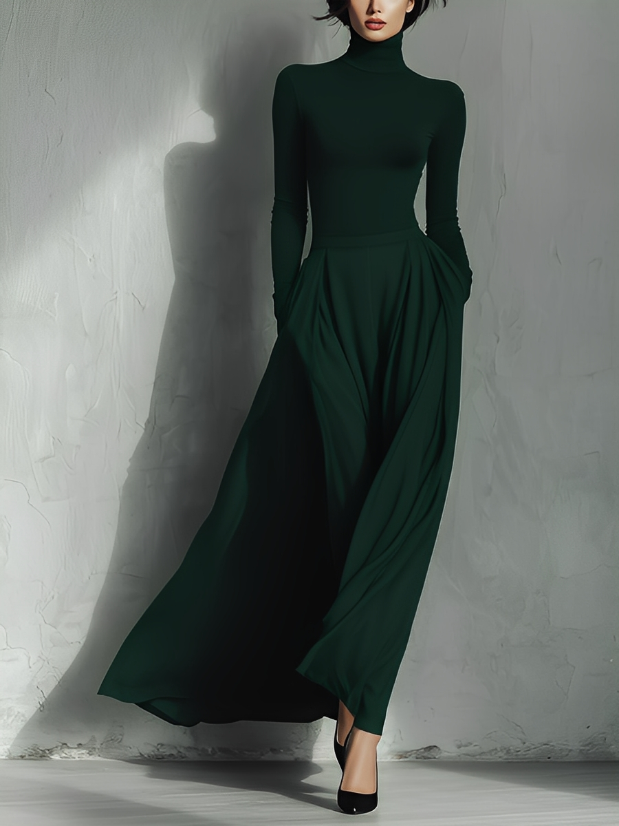 Women's Dark Green Stretchy Knit Turtleneck Slim-fit Long Dress MDA0875L3T