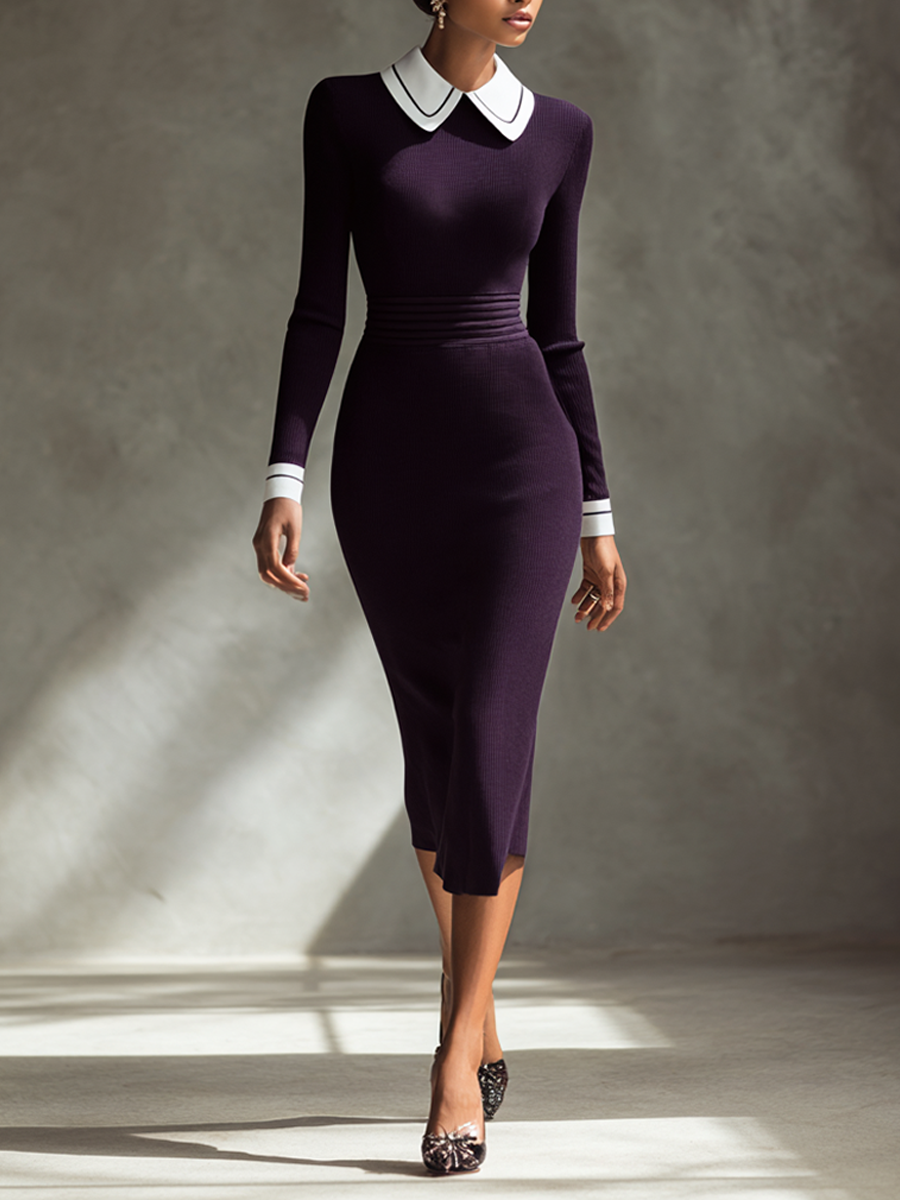 Women's Dark Purple Knit Midi Dress With Color-Blocked Collar MDA0866L6AP