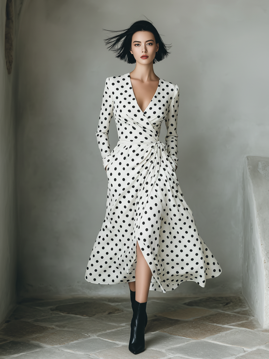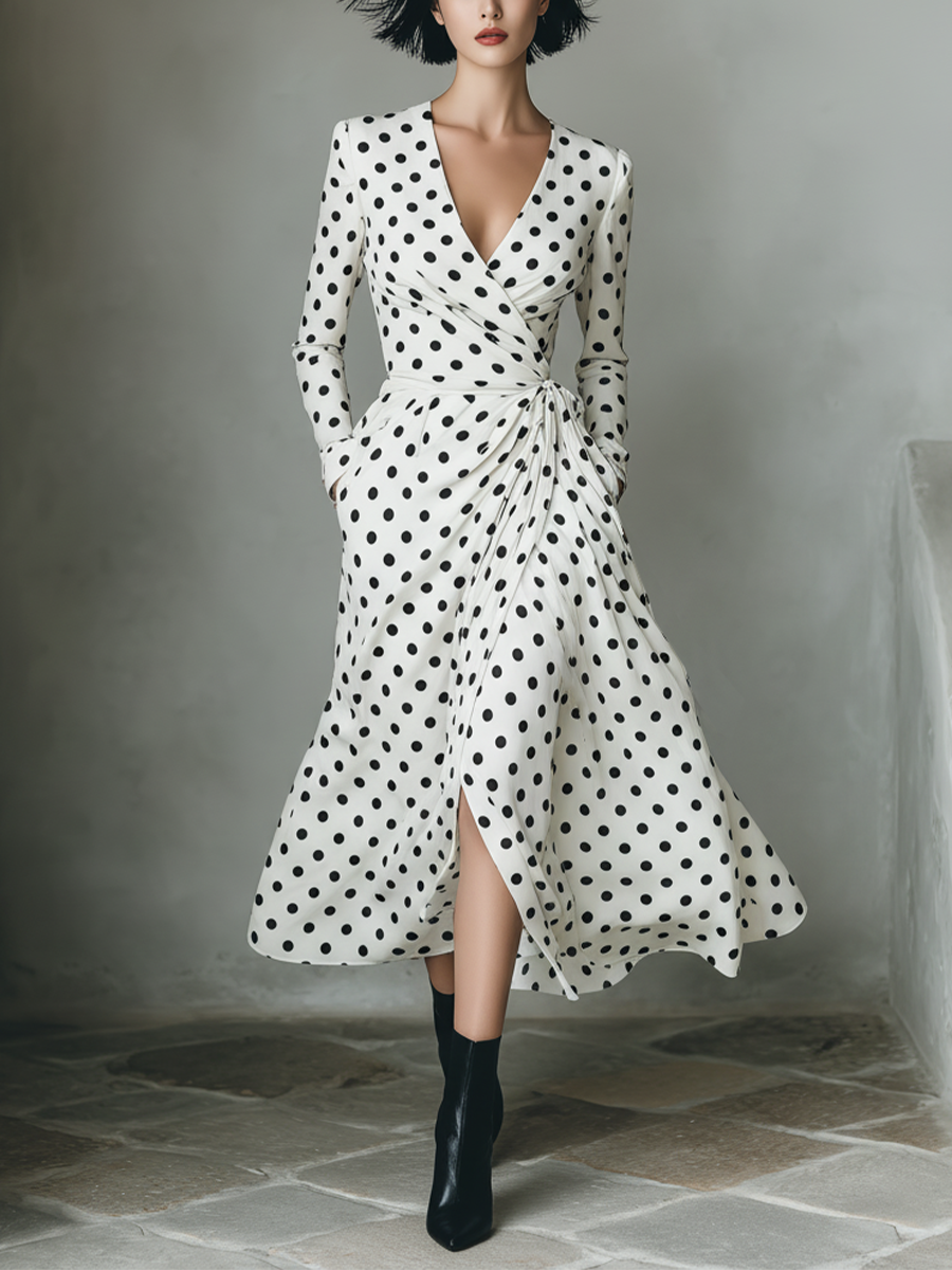 Women's White Polka Dot Vintage V-neck Fitted Midi Dress MDA0570L7T