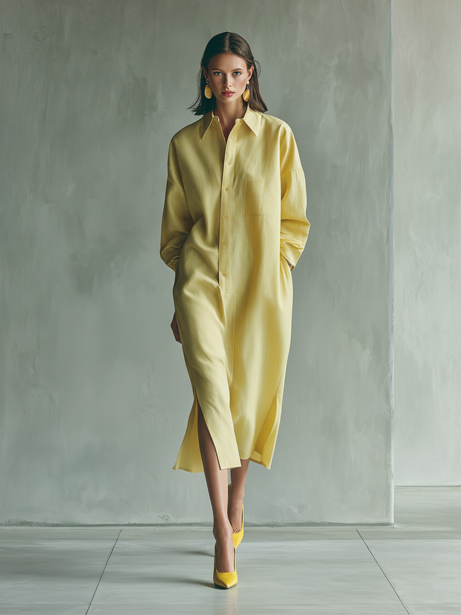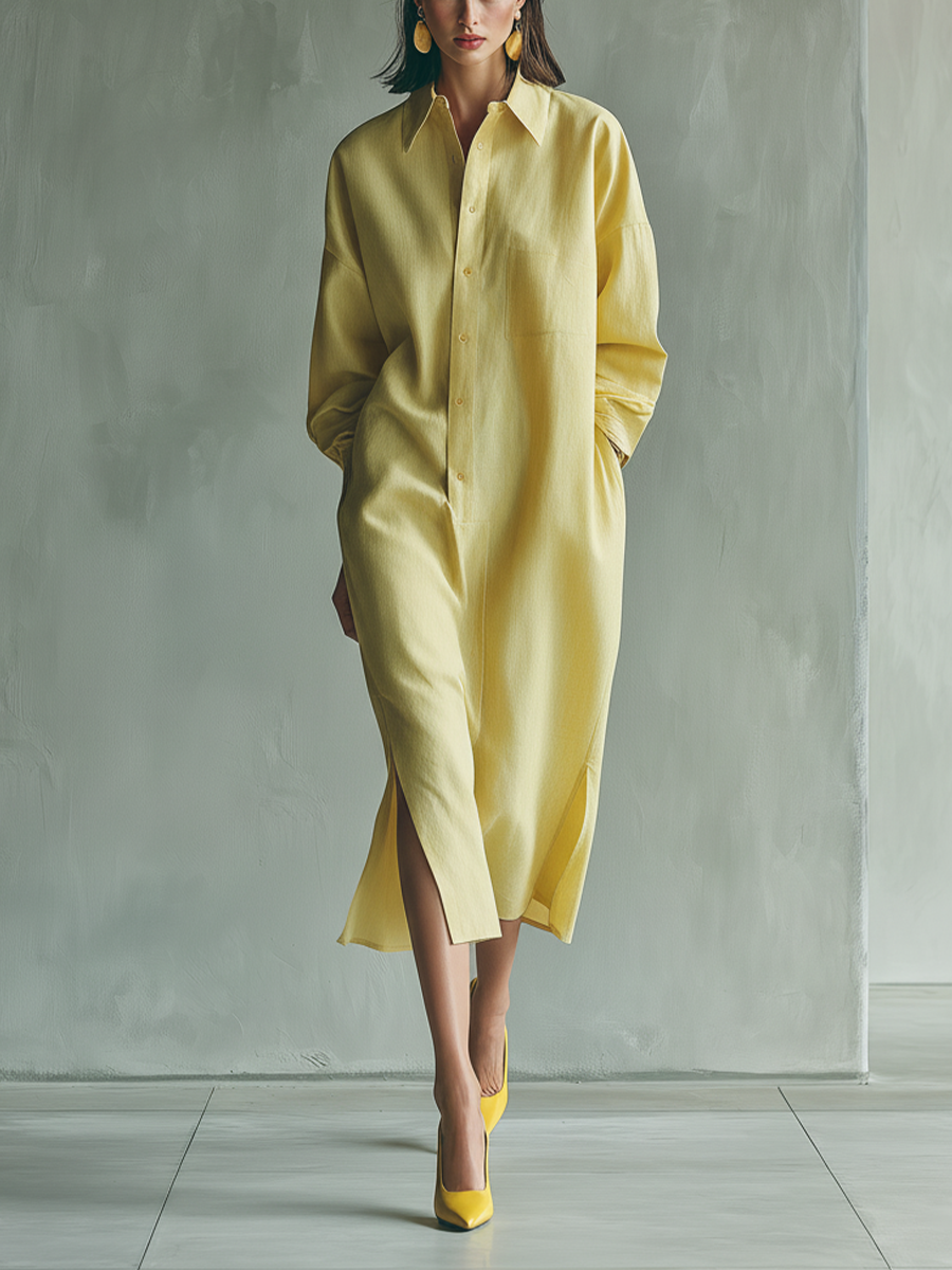 Women's Yellow Linen Fabric Oversized Collared Shirt Midi Dress MDA0925L5T