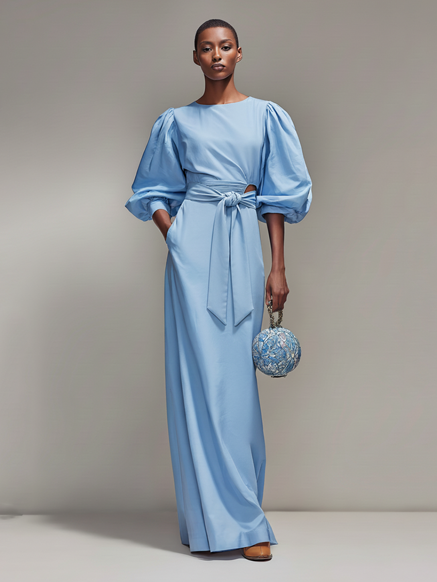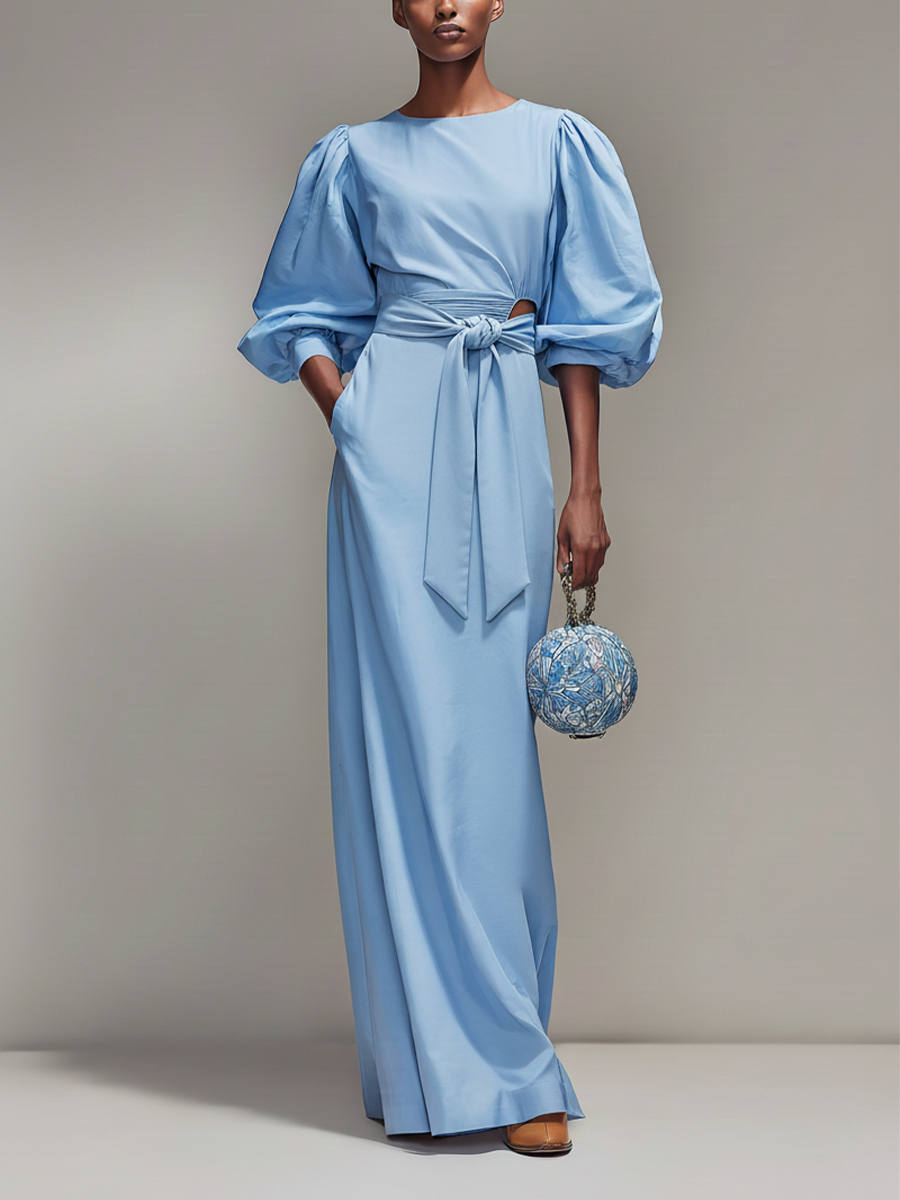 Women's Light Blue Cotton Blend Puff-sleeved Crop Top Long Dress MDA0974L7T