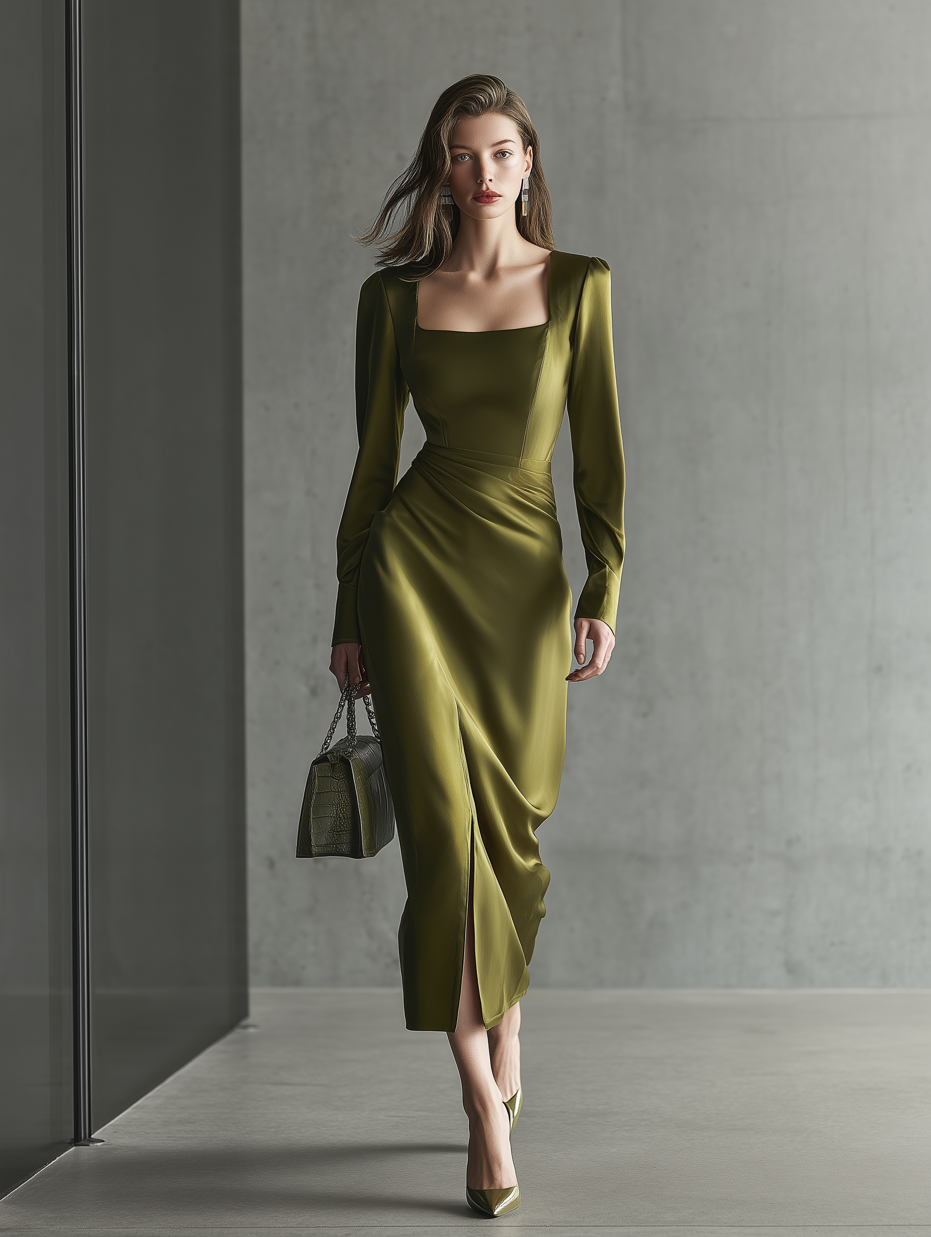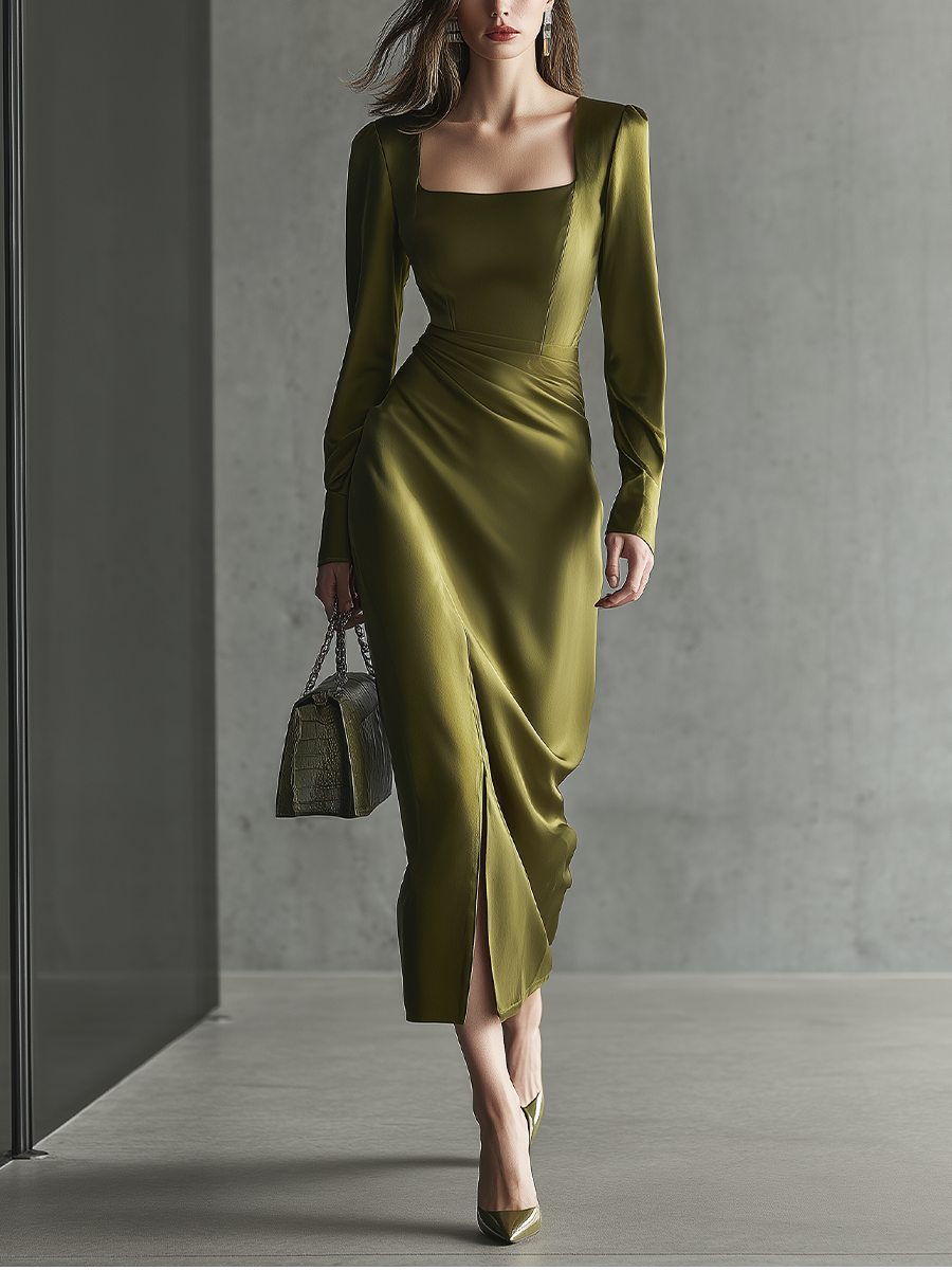 Women's Olive Green Satin Fabric Square-Neck Ruched Slit Midi Dress MDA0990L7T
