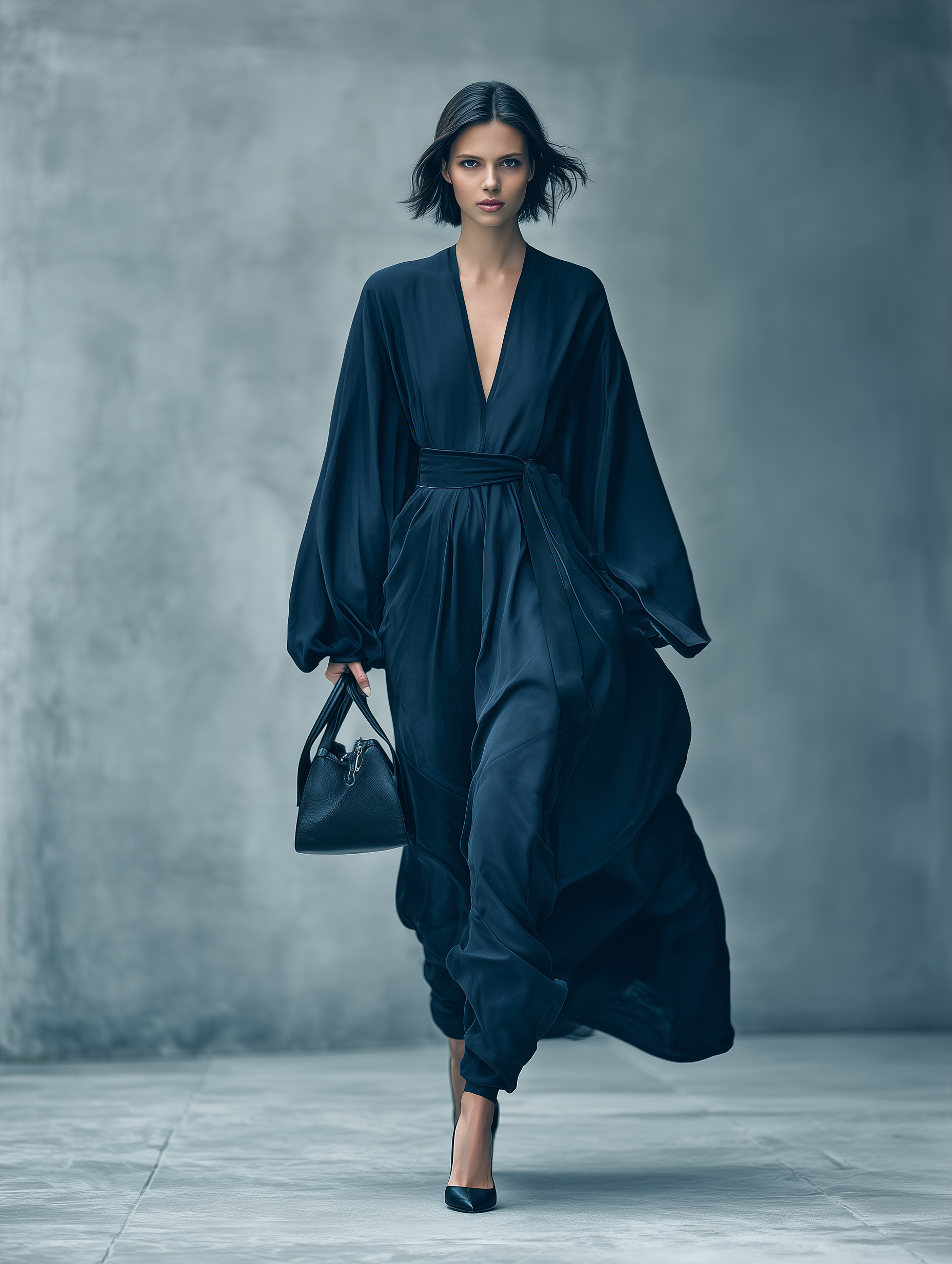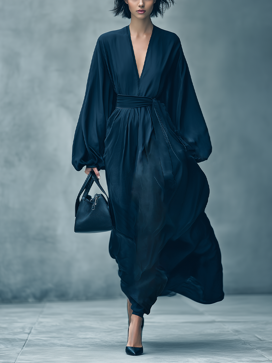 Women's Navy Blue Cotton Blend Deep V-neck Puff Sleeve Belted Long Dress MDA0951L9T