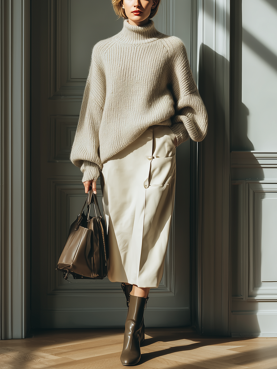 Women's Beige Turtleneck, Wide-leg Pants, And Minimalist Knitted Chic Suit MDA2446J0I