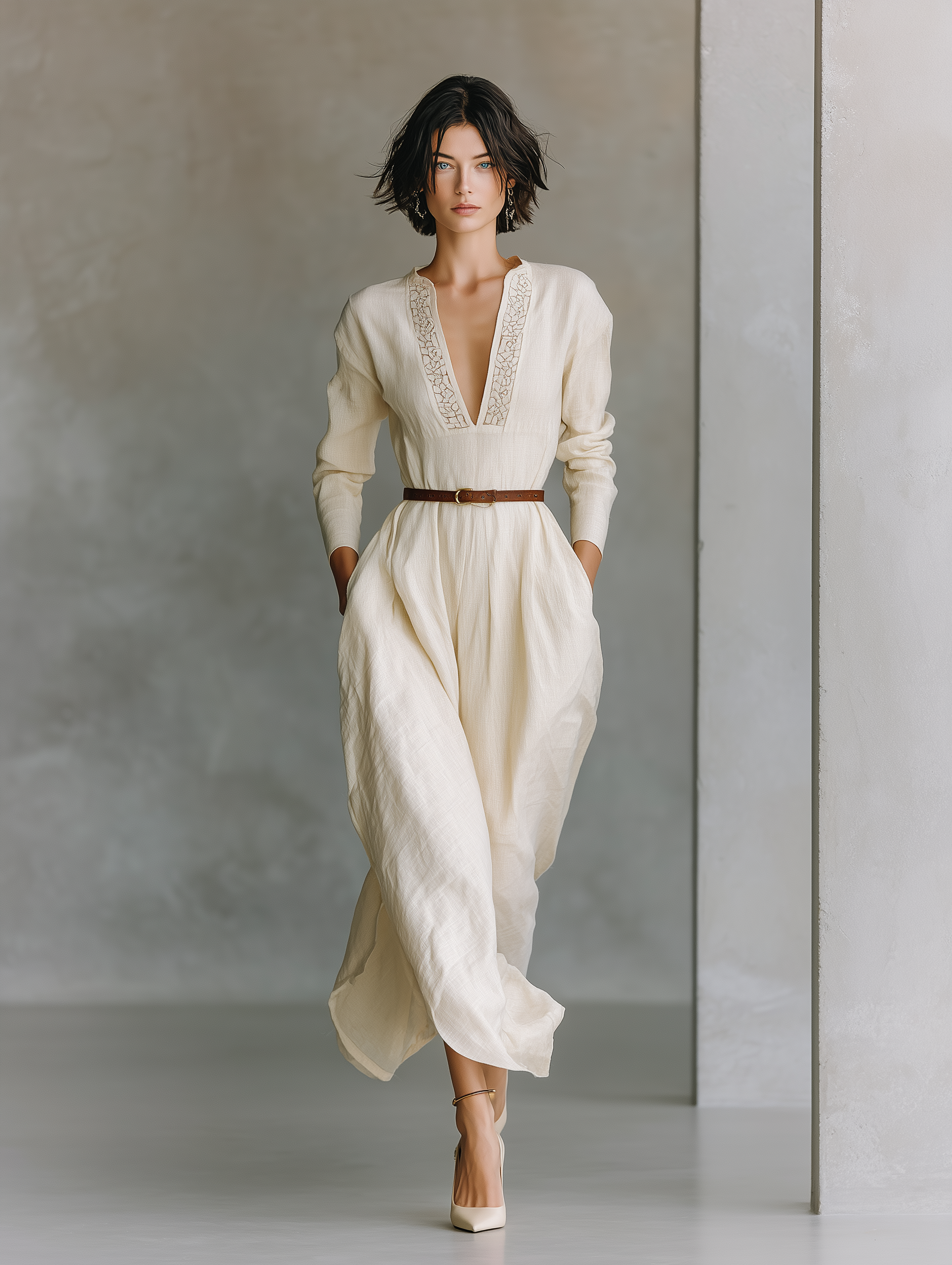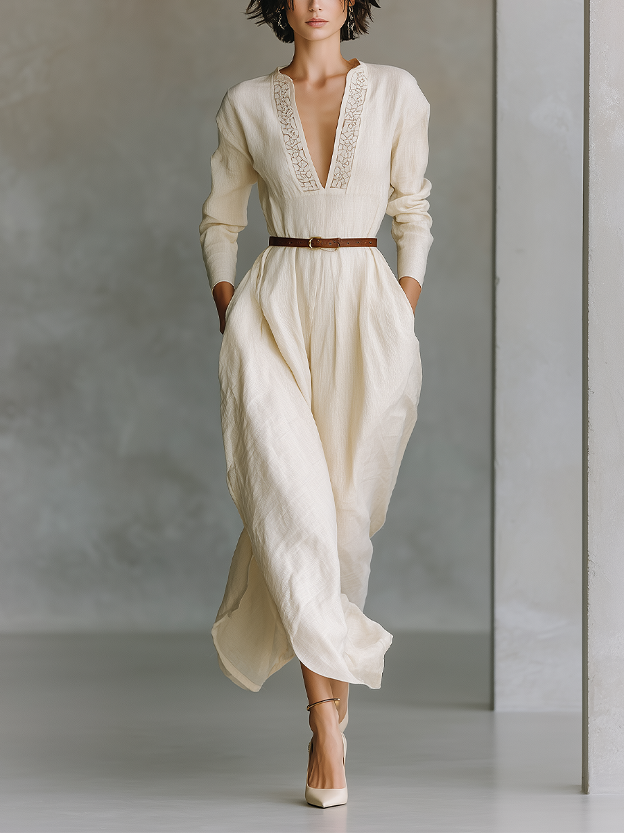 Women's Ivory Linen Fabric Deep V-Neck Embroidered Trim Belted Maxi Dress MDA1540L2T