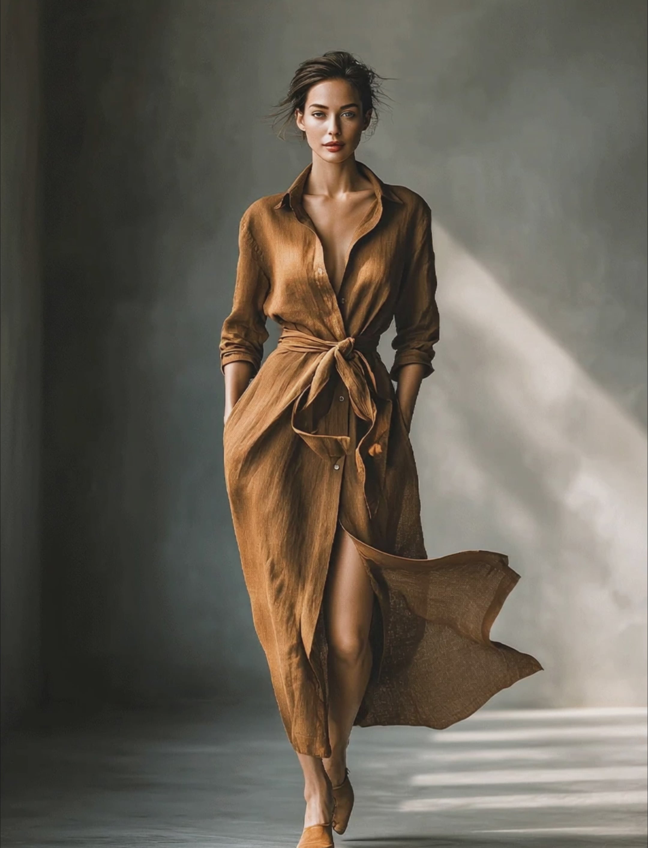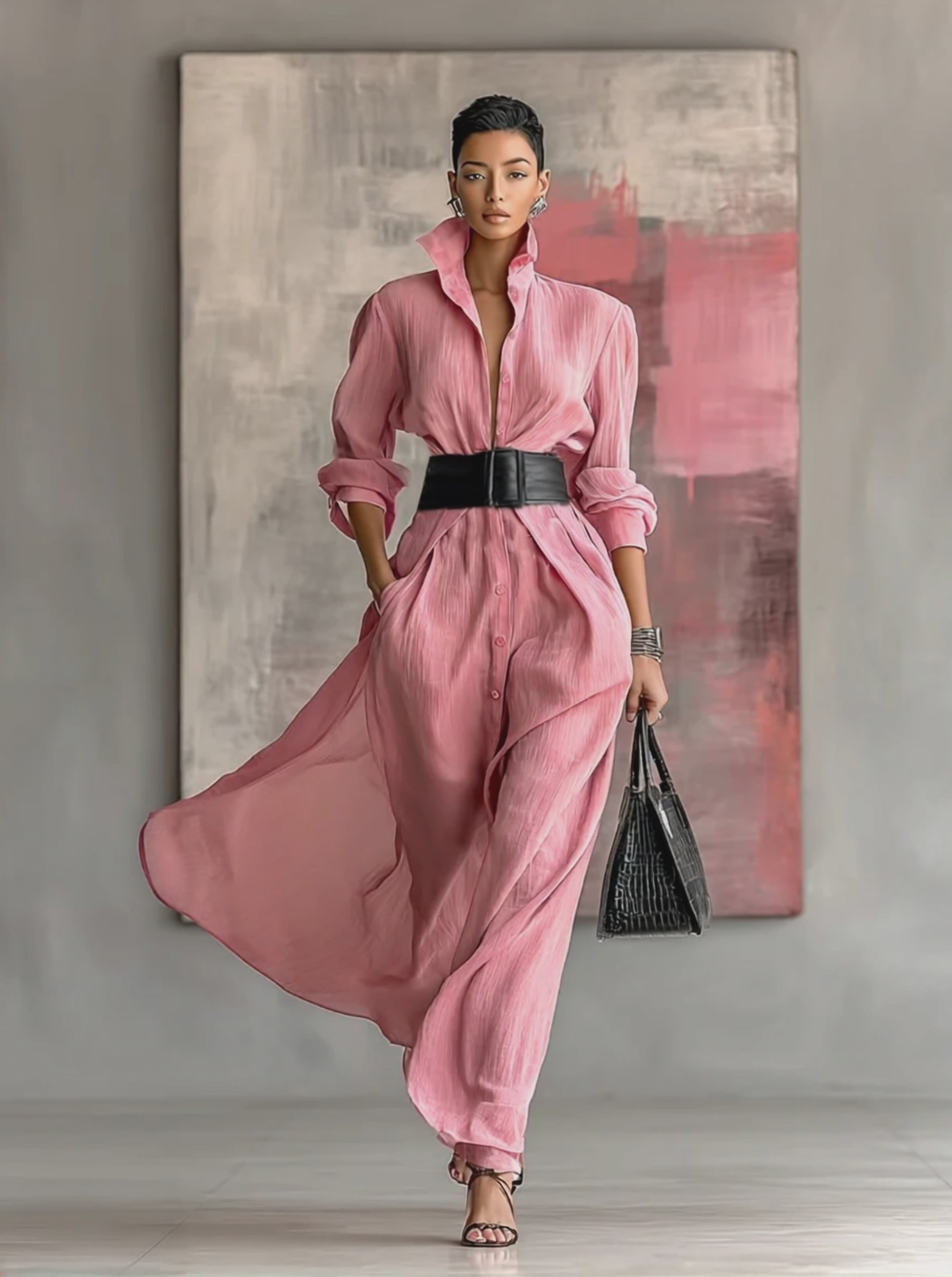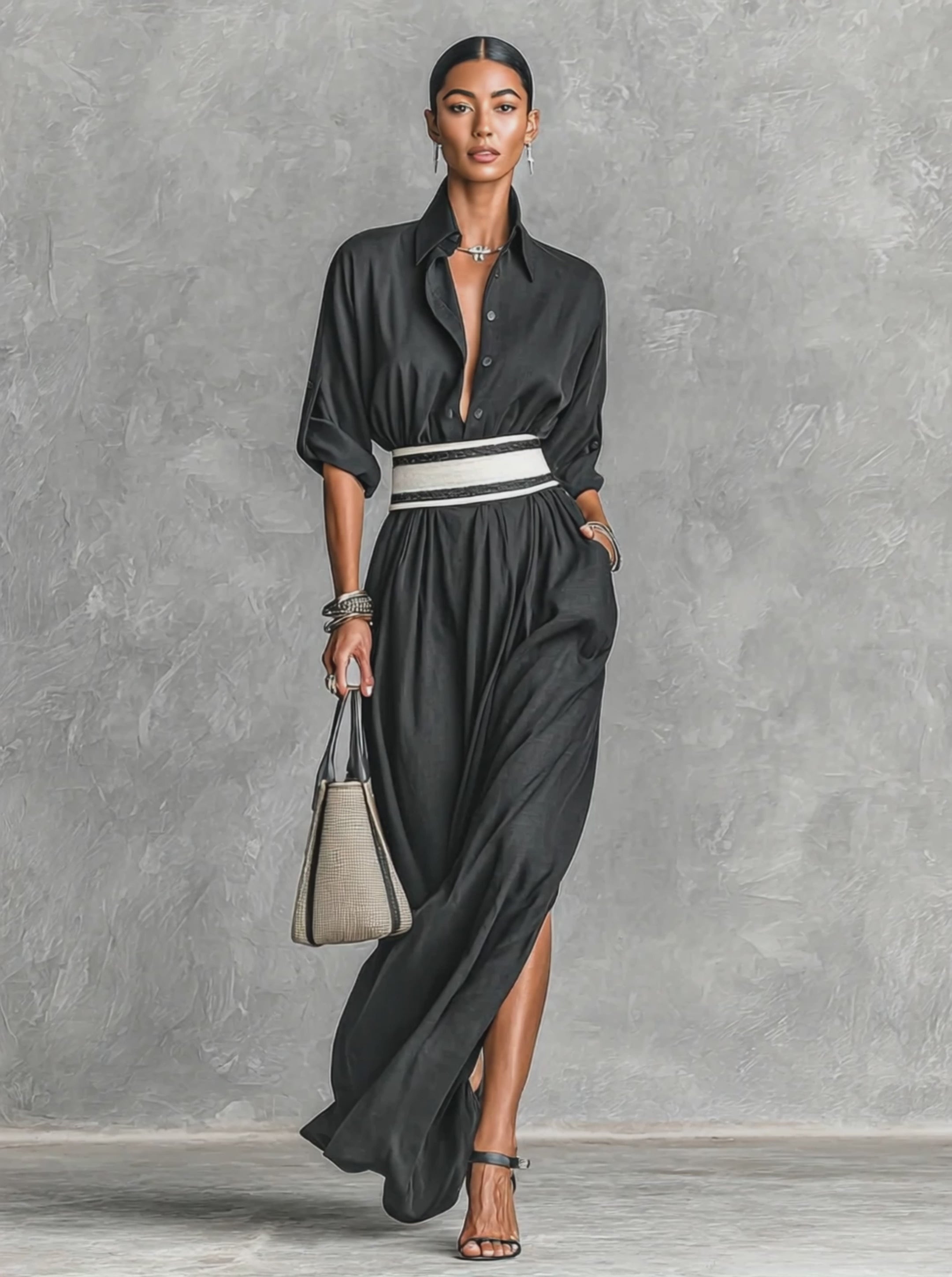 Women's Lapel Long Sleeve Waist-tightening Maxi Dress (without Belt)MDA2480G9Y