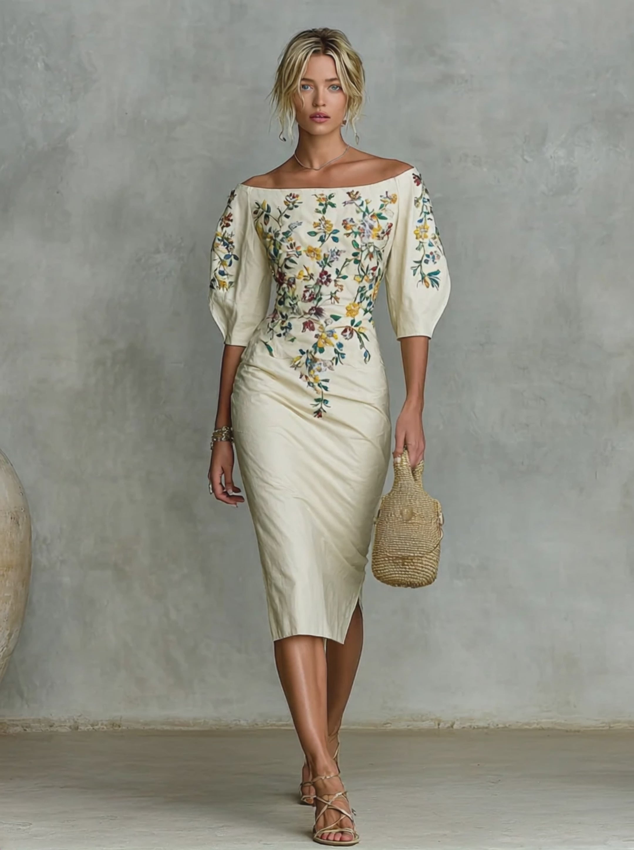 Women's One-shoulder Neck Mid-length Sleeve Floral Embroidery Waist-length Midi Dress MDA1927G4Y